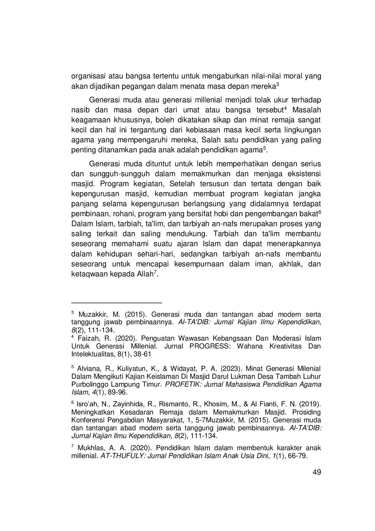 Berdasarkan latar belakang, metode, hasil, dan keterbatasan penelitian ini, serta mempertimbangkan saran penelitian lanjutan yang telah ada, beberapa saran penelitian lanjutan yang dapat dikembangkan antara lain: pertama, perlu dilakukan penelitian lebih lanjut untuk mengidentifikasi faktor-faktor kontekstual yang mempengaruhi efektivitas program pembinaan ilmu agama bagi generasi milenial di berbagai wilayah dengan karakteristik sosial budaya yang berbeda. Hal ini penting untuk memastikan bahwa program yang dirancang dapat disesuaikan dengan kebutuhan dan harapan masyarakat setempat. Kedua, penelitian dapat difokuskan pada pengembangan model pembinaan ilmu agama yang mengintegrasikan teknologi informasi dan komunikasi (TIK) untuk meningkatkan daya tarik dan aksesibilitas program bagi generasi milenial. Pemanfaatan media sosial, aplikasi pembelajaran, dan platform daring lainnya dapat menjadi sarana efektif untuk menjangkau audiens yang lebih luas dan memberikan pengalaman belajar yang lebih interaktif. Ketiga, penelitian dapat mengeksplorasi peran serta aktif orang tua dan tokoh masyarakat dalam mendukung program pembinaan ilmu agama bagi generasi milenial. Keterlibatan orang tua dan tokoh masyarakat dapat menciptakan lingkungan belajar yang kondusif dan memperkuat nilai-nilai keagamaan dalam keluarga dan komunitas.