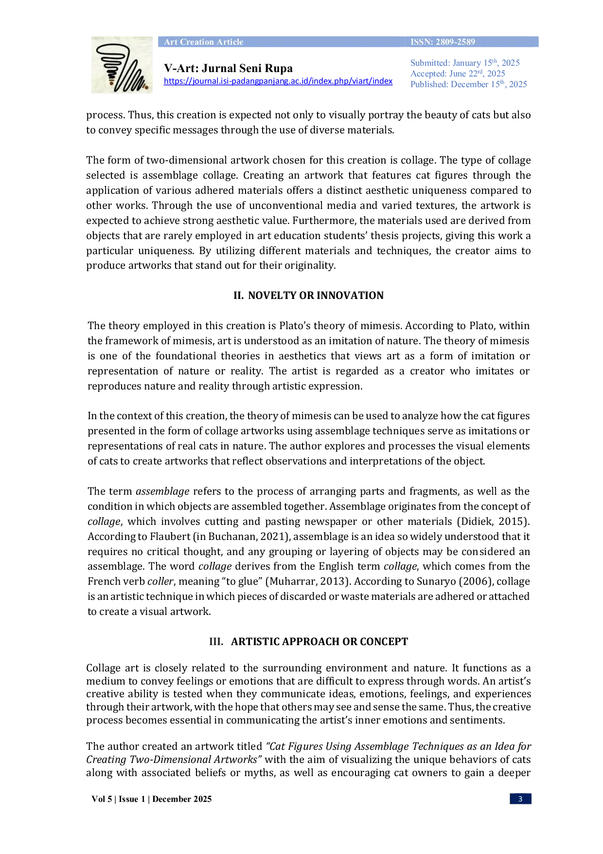 V-art: Journal of Fine ArtV-art: Journal of Fine ArtProses penciptaan karya seni ini sangat dipengaruhi oleh pengalaman pribadi seniman. Keterikatan emosional terhadap kucing menjadi sumber inspirasi utama dalam proses kreatif. Penelitian ini bertujuan mendeskripsikan tahapan kreatif dalam memvisualisasikan figur kucing sebagai ide seni dua‑dimensi dengan pendekatan teknik assemblage. Metode yang dipakai mengacu pada tahapan Alma M. Hawkins, yaitu eksplorasi, improvisasi, dan realisasi. Pada tahap eksplorasi dilakukan pengumpulan data langsung melalui observasi serta tinjauan literatur; tahap improvisasi meliputi pengembangan pola gambar dan percobaan bentuk serta teknik assemblage; dan tahap realisasi mengeksekusi karya sesuai desain hingga selesai. Karakteristik khas kucing menginspirasi kolase yang memadukan teknik assemblage, media campuran, serta bahan seperti clay, kertas tisu, dan potongan majalah. Karya yang dihasilkan menampilkan perilaku harian kucing pada kanvas berukuran 50 × 60 cm, terdiri dari tiga buah karya yang menggambarkan beragam perilaku, mitos, dan kepercayaan terhadap kucing yang dapat ditafsirkan dalam konteks kehidupan manusia.