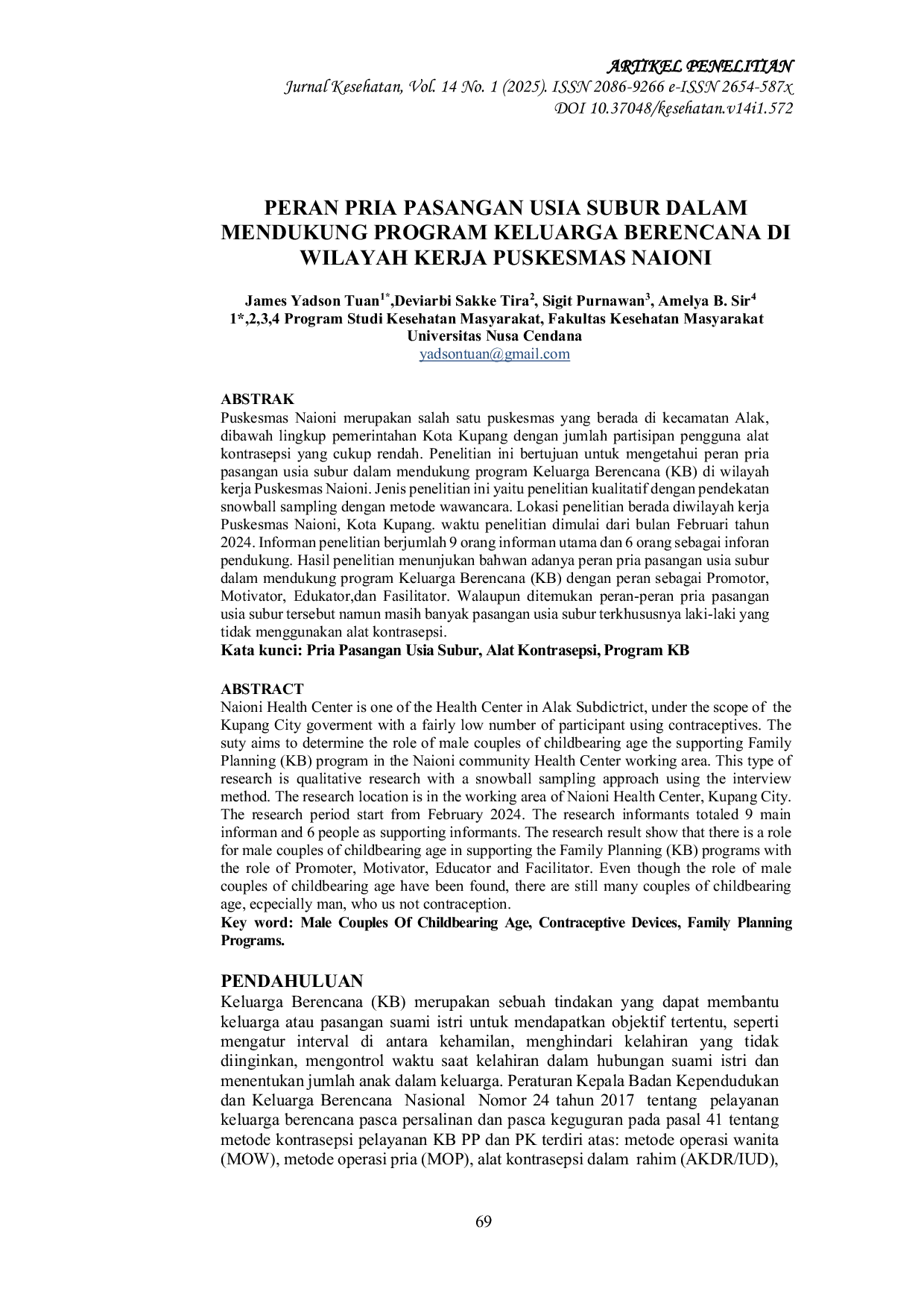 Jurnal KesehatanJurnal KesehatanNaioni merupakan salah satu puskesmas yang berada di kecamatan Alak, di bawah lingkup pemerintahan Kota Kupang dengan jumlah partisipan pengguna alat kontrasepsi yang cukup rendah. Penelitian ini bertujuan untuk mengetahui peran pria pasangan usia subur dalam mendukung program Keluarga Berencana (KB) di wilayah kerja Puskesmas Naioni. Jenis penelitian ini yaitu penelitian kualitatif dengan pendekatan snowball sampling dengan metode wawancara. Lokasi penelitian berada di wilayah kerja Puskesmas Naioni, Kota Kupang. Waktu penelitian dimulai dari bulan Februari tahun 2024. Informan penelitian berjumlah 9 orang informan utama dan 6 orang sebagai informan pendukung. Hasil penelitian menunjukkan bahwa ada peran pria pasangan usia subur dalam mendukung program Keluarga Berencana (KB) dengan peran sebagai Promotor, Motivator, Edukator, dan Fasilitator. Walaupun ditemukan peran-peran pria pasangan usia subur tersebut namun masih banyak pasangan usia subur terkhususnya laki-laki yang tidak menggunakan alat kontrasepsi.