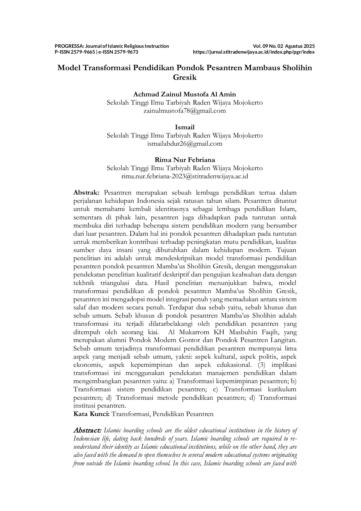 PROGRESSA: Journal of Islamic Religious InstructionPROGRESSA: Journal of Islamic Religious InstructionPesantren merupakan sebuah lembaga pendidikan tertua dalam perjalanan kehidupan Indonesia sejak ratusan tahun silam. Pesantren dituntut untuk memahami kembali identitasnya sebagai lembaga pendidikan Islam, sementara di pihak lain, pesantren juga dihadapkan pada tuntutan untuk membuka diri terhadap beberapa sistem pendidikan modern yang bersumber dari luar pesantren. Dalam hal ini pondok pesantren dihadapkan pada tuntutan untuk memberikan kontribusi terhadap peningkatan mutu pendidikan, kualitas sumber daya insani yang dibutuhkan dalam kehidupan modern. Tujuan penelitian ini adalah untuk mendeskripsikan model transformasi pendidikan pesantren pondok pesantren Mambaus Sholihin Gresik, dengan menggunakan pendekatan penelitian kualitatif deskriptif dan pengujian keabsahan data dengan tekhnik triangulasi data. Hasil penelitian menunjukkan bahwa, model transformasi pendidikan di pondok pesantren Mambaus Sholihin Gresik, pesantren ini mengadopsi model integrasi penuh yang memadukan antara sistem salaf dan modern secara penuh. Terdapat dua sebab yaitu, sebab khusus dan sebab umum. Sebab khusus di pondok pesantren Mambaus Sholihin adalah transformasi itu terjadi dilatarbelakangi oleh pendidikan pesantren yang ditempuh oleh seorang kiai. Al Mukarrom KH Masbuhin Faqih, yang merupakan alumni Pondok Modern Gontor dan Pondok Pesantren Langitan. Sebab umum terjadinya transformasi pendidikan pesantren mempunyai lima aspek yang menjadi sebab umum, yakni: aspek kultural, aspek politis, aspek ekonomis, aspek kepemimpinan dan aspek edukasional.