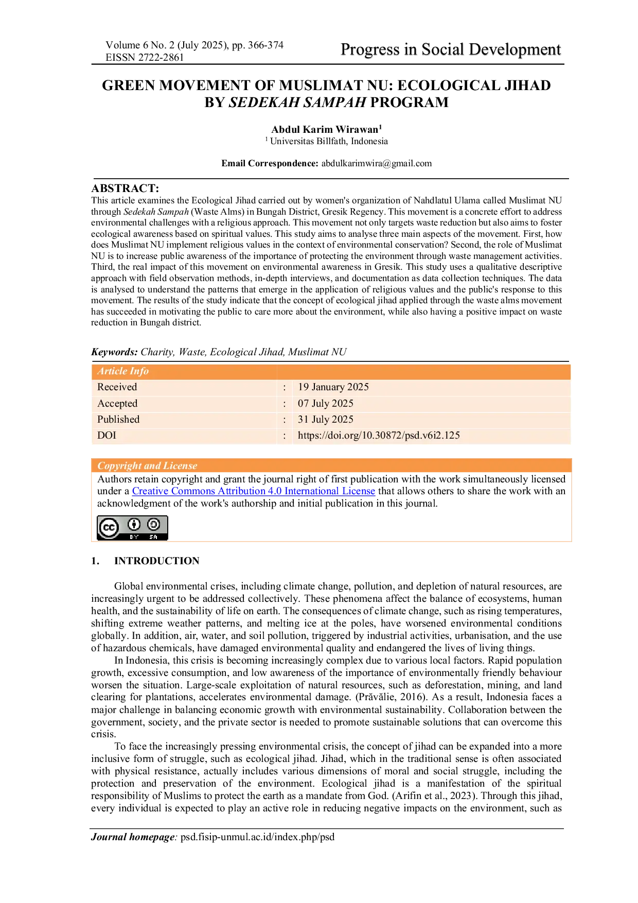 - Progress in Social Development. green movement muslimat nu ecological jihad sedekah sampah program progress... psd.fisip-unmul.ac.id/index.php/psd/article/view/125Progress in Social Development green movement muslimat nu ecological jihad sedekah sampah program progress psd fisip unmul ac index php psd article view 125