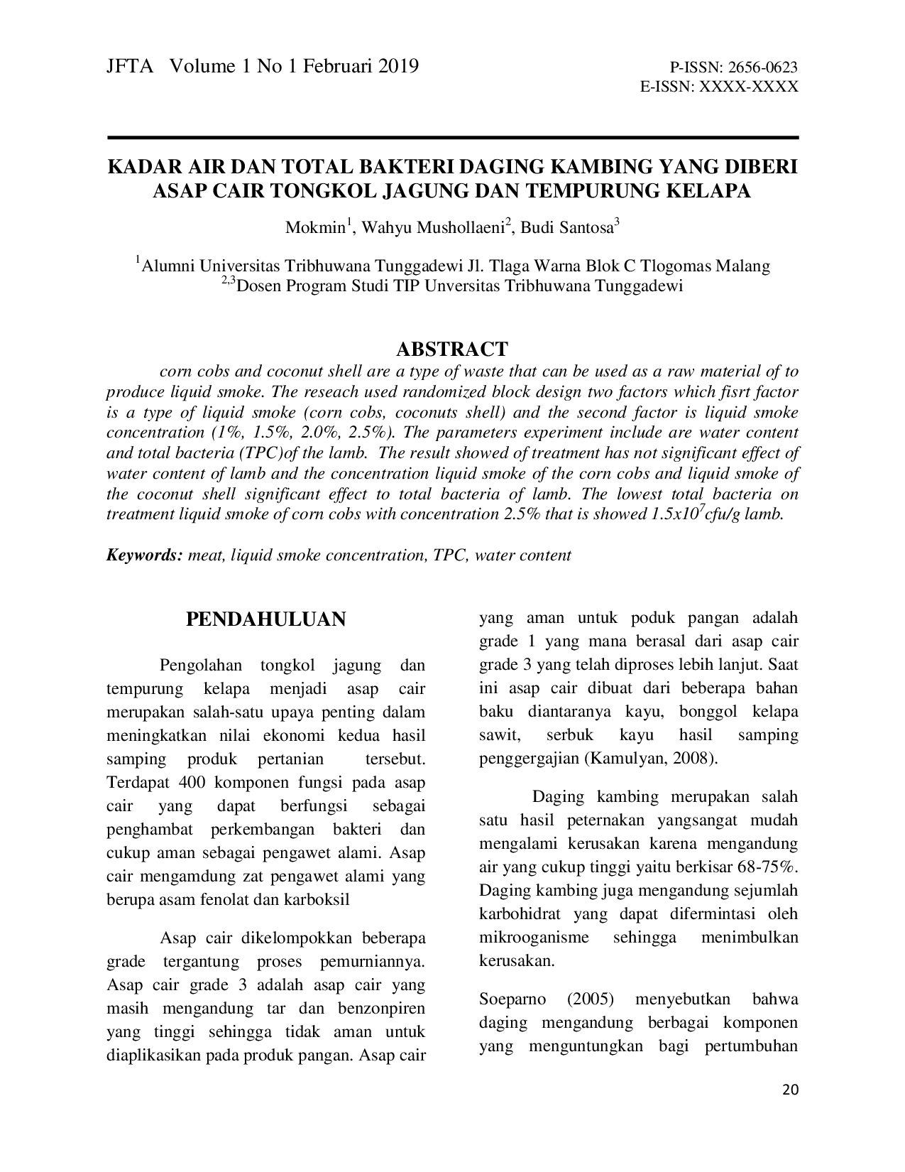 Journal of Food Technology and AgroindustryJournal of Food Technology and AgroindustryLimbah pertanian seperti tongkol jagung dan tempurung kelapa dapat dimanfaatkan sebagai bahan baku untuk menghasilkan asap cair. Penelitian ini menggunakan rancangan acak blok faktorial dengan dua faktor: jenis asap cair (tongkol jagung, tempurung kelapa) dan konsentrasi asap cair (1%, 1.5%, 2.0%, 2.5%). Parameter yang diukur adalah kadar air dan total bakteri (TPC) daging kambing. Hasil penelitian menunjukkan bahwa perlakuan tidak memberikan pengaruh signifikan terhadap kadar air daging kambing, namun konsentrasi asap cair dari tongkol jagung dan tempurung kelapa berpengaruh signifikan terhadap total bakteri daging kambing. Total bakteri terendah diperoleh pada perlakuan asap cair tongkol jagung dengan konsentrasi 2.5%, yaitu 1.5x107 cfu/g daging kambing.