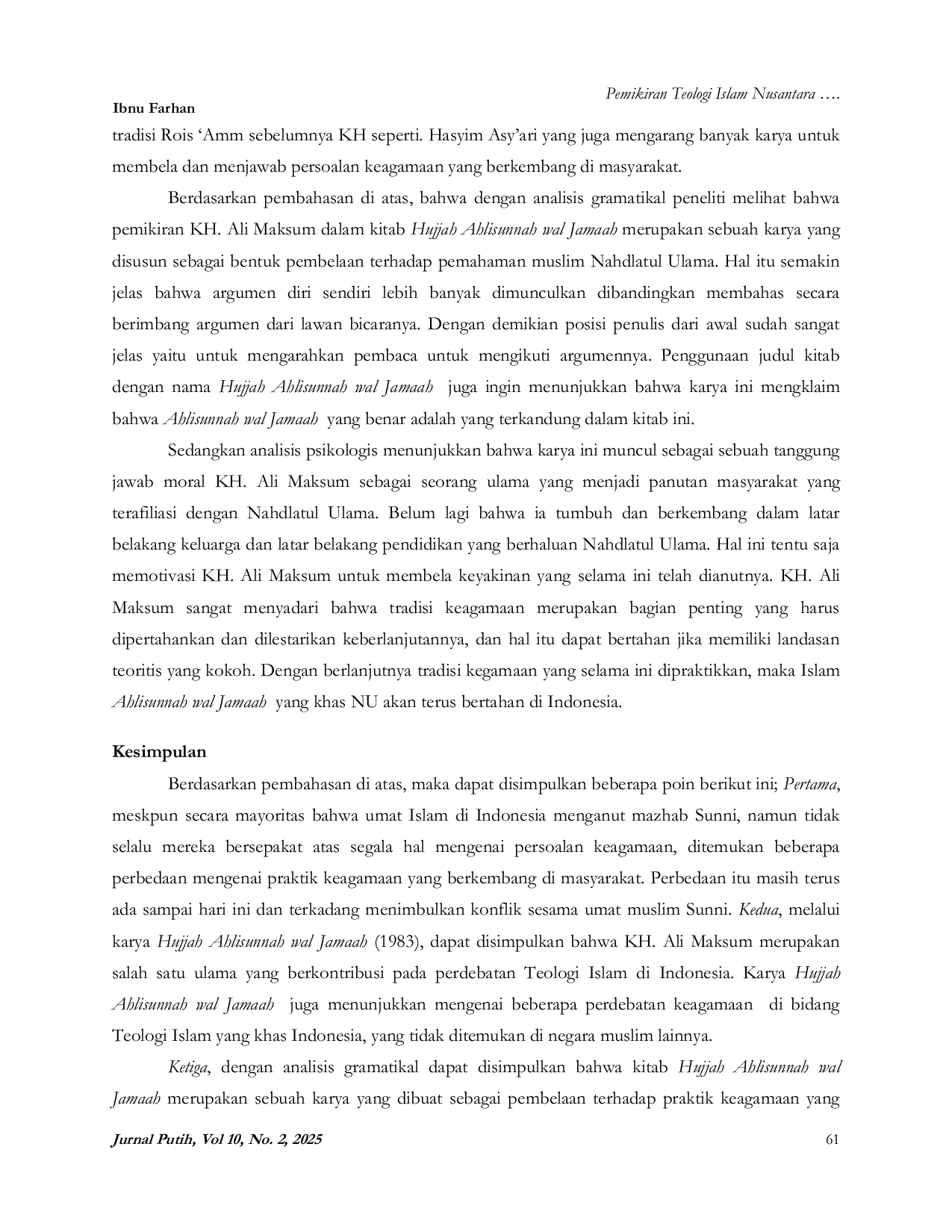 PUTIH: Jurnal Pengetahuan Tentang Ilmu dan HikmahPUTIH: Jurnal Pengetahuan Tentang Ilmu dan HikmahTeologi atau ilmu kalam merupakan salah satu cabang dari Ilmu keislaman. Meskipun ilmu tersebut masuk kategori ilmu klasik namun pembahasan di dalamnya berkembang sesuai dengan zaman. Tujuan penelitian ini adalah untuk mengkaji pemikiran teologi Islam ulama nusantara yaitu Kh. Ali Maksum dalam kitab Hujjah Ahlisunnah Wal Jamaah, dan menganalisisnya menggunakan perspektif hermeneutika. Metodologi penelitian kualitatif melalui studi kepustakaan dengan teori hermeneutika Schleiermacher menunjukkan bahwa karya Kh. Ali Maksum merupakan pembelaan terhadap praktik keagamaan Sunni NU yang meliputi aqidah, fiqh, dan tasawuf, sekaligus menegaskan legitimasi Ahlisunnah Wal Jamaah sebagai tradisi mayoritas Indonesia.