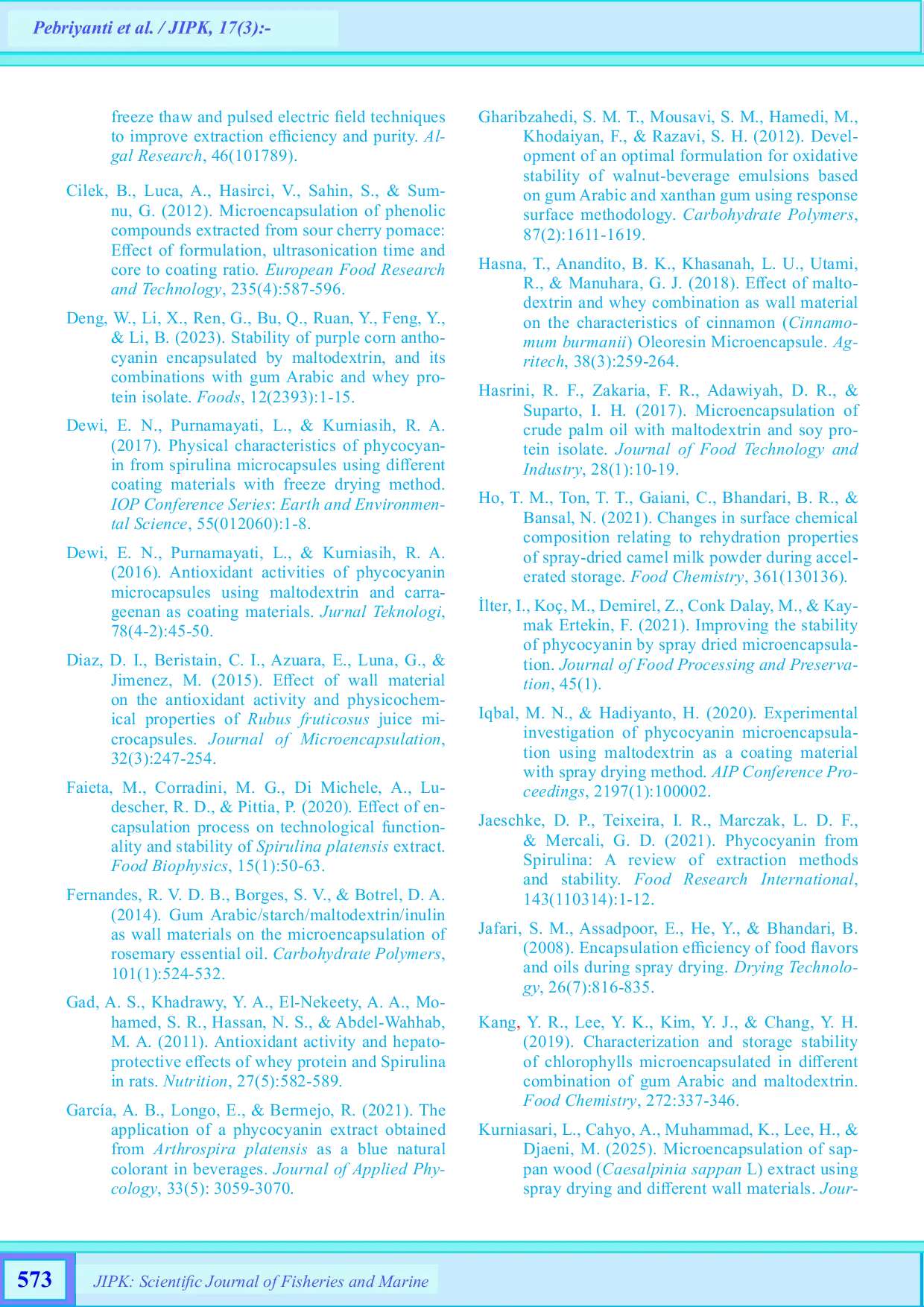 Bagaimana pengaruh variasi rasio kombinasi gum arabic, maltodekstrin, dan whey protein isolate terhadap stabilitas phycocyanin pada kondisi penyimpanan jangka panjang (suhu, cahaya, kelembaban) dapat diteliti untuk mengoptimalkan umur simpan produk? Apakah penambahan antioksidan alami tambahan, seperti ekstrak kulit buah atau polifenol, dapat meningkatkan efisiensi enkapsulasi dan aktivitas antioksidan mikrokapsel phycocyanin tanpa mengurangi kelarutan? Studi skala industri yang mengevaluasi performa proses spray drying dengan parameter aliran udara dan suhu inlet yang lebih tinggi, serta analisis biaya‑manfaat, diperlukan untuk menilai kelayakan komersialisasi formulasi optimal (8,3% GA, 11,7% MD, 5,2% WPI). Selain itu, uji bioavailabilitas dan efek farmakologis mikrokapsel phycocyanin pada model hewan atau sel manusia dapat memberikan bukti ilmiah tentang manfaat kesehatan potensial dari produk yang dioptimalkan ini.