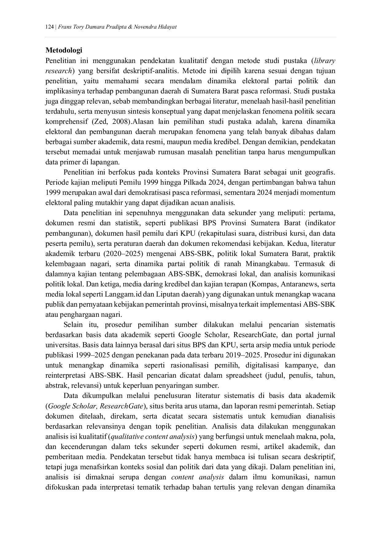 Dinamika politik elektoral Sumatera Barat pasca-reformasi menunjukkan karakter khas yang dibentuk oleh perpaduan nilai Islamisasi Minangkabau (ABS-SBK), budaya egalitarian, dan tradisi merantau.Temuan penelitian ini menegaskan bahwa ABS-SBK masih menjadi rujukan moral dan simbol politik, namun telah mengalami reinterpretasi seiring tuntutan modernisasi dan digitalisasi tata kelola.PKS mendominasi arena Pilkada karena basis religius dan kaderisasi yang kuat, tetapi tidak menguasai DPRD secara absolut.kondisi ini menciptakan fragmentasi legislatif yang justru memperkuat mekanisme musyawarah dan kontrol politik.Sejak 2014, meningkatnya kekuatan partai nasionalis seperti Gerindra, Golkar, dan NasDem menunjukkan pergeseran perilaku pemilih menuju rasionalitas berbasis isu pembangunan dan kinerja.Selain itu, diaspora Minangkabau terbukti menjadi aktor penting dalam politik dan pembangunan melalui dukungan finansial, jejaring sosial, serta pengaruh terhadap kebijakan lokal.Keseluruhan dinamika ini memperlihatkan bahwa demokrasi Sumatera Barat telah mencapai konsolidasi matang, dengan keseimbangan antara nilai budaya, rasionalitas politik, dan keterlibatan trans-lokal yang menjadikannya model demokrasi daerah yang adaptif dan berakar kuat pada tradisi.