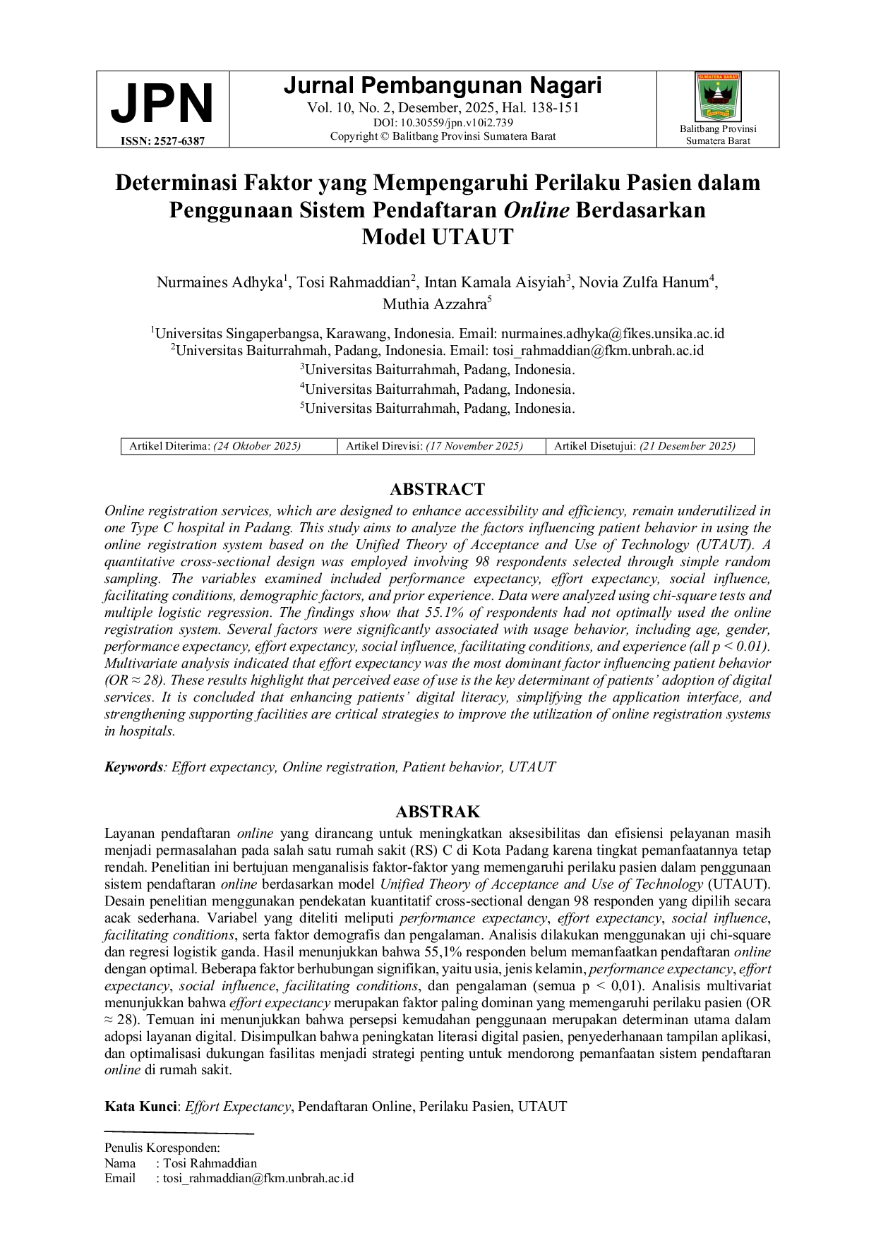 Jurnal Pembangunan NagariJurnal Pembangunan NagariLayanan pendaftaran online yang dirancang untuk meningkatkan aksesibilitas dan efisiensi pelayanan masih menjadi permasalahan pada salah satu rumah sakit (RS) C di Kota Padang karena tingkat pemanfaatannya tetap rendah. Penelitian ini bertujuan menganalisis faktor-faktor yang memengaruhi perilaku pasien dalam penggunaan sistem pendaftaran online berdasarkan model Unified Theory of Acceptance and Use of Technology (UTAUT). Desain penelitian menggunakan pendekatan kuantitatif cross-sectional dengan 98 responden yang dipilih secara acak sederhana. Variabel yang diteliti meliputi performance expectancy, effort expectancy, social influence, facilitating conditions, serta faktor demografis dan pengalaman. Analisis dilakukan menggunakan uji chi-square dan regresi logistik ganda. Hasil menunjukkan bahwa 55,1% responden belum memanfaatkan pendaftaran online dengan optimal. Beberapa faktor berhubungan signifikan, yaitu usia, jenis kelamin, performance expectancy, effort expectancy, social influence, facilitating conditions, dan pengalaman (semua p < 0,01). Analisis multivariat menunjukkan bahwa effort expectancy merupakan faktor paling dominan yang memengaruhi perilaku pasien (OR ≈ 28). Temuan ini menunjukkan bahwa persepsi kemudahan penggunaan merupakan determinan utama dalam adopsi layanan digital. Disimpulkan bahwa peningkatan literasi digital pasien, penyederhanaan tampilan aplikasi, dan optimalisasi dukungan fasilitas menjadi strategi penting untuk mendorong pemanfaatan sistem pendaftaran online di rumah sakit.