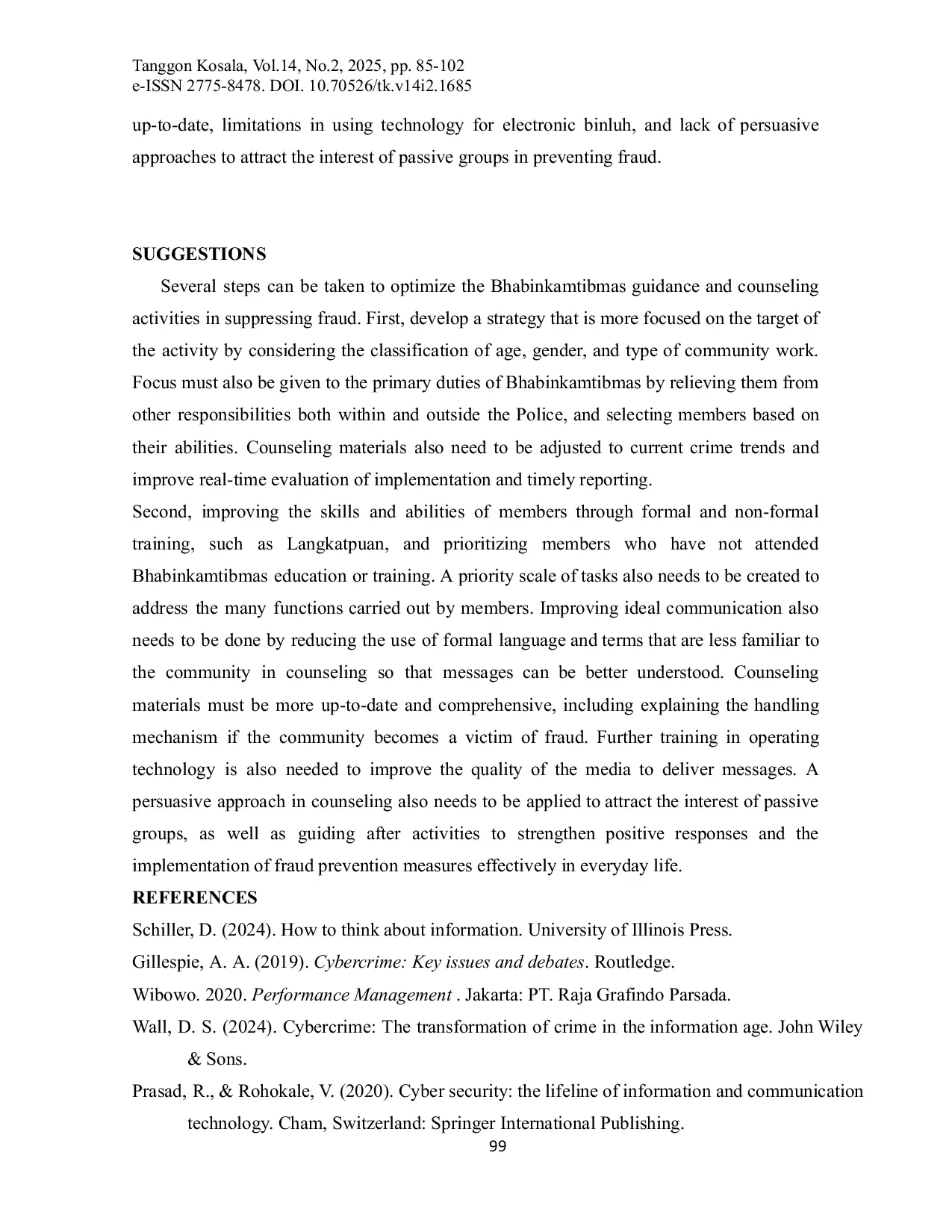 Berdasarkan temuan penelitian, beberapa saran penelitian lanjutan dapat diajukan. Pertama, perlu dilakukan penelitian lebih lanjut mengenai efektivitas berbagai metode penyuluhan dalam meningkatkan kesadaran masyarakat tentang penipuan, dengan mempertimbangkan karakteristik demografis dan tingkat pendidikan masyarakat. Kedua, penelitian dapat difokuskan pada pengembangan model komunikasi yang lebih efektif antara Bhabinkamtibmas dan masyarakat, dengan memanfaatkan teknologi digital dan media sosial untuk menjangkau audiens yang lebih luas. Ketiga, penelitian kuantitatif dapat dilakukan untuk mengukur dampak program bimbingan dan penyuluhan Bhabinkamtibmas terhadap penurunan angka penipuan di wilayah hukum Polresta Kediri, dengan menggunakan data statistik dan analisis regresi. Ketiga saran ini diharapkan dapat memberikan kontribusi dalam meningkatkan efektivitas pencegahan penipuan melalui peran Bhabinkamtibmas.