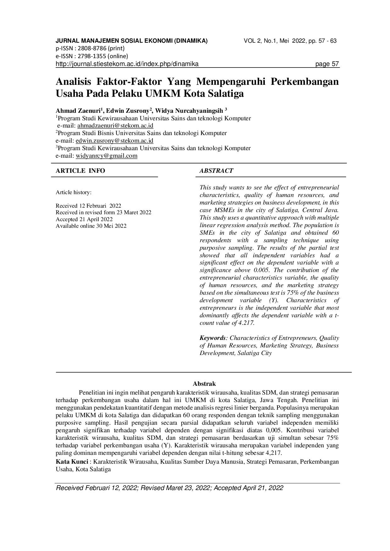 Dinamika: Jurnal Manajemen Sosial EkonomiDinamika: Jurnal Manajemen Sosial EkonomiPenelitian ini ingin melihat pengaruh karakteristik wirausaha, kualitas SDM, dan strategi pemasaran terhadap perkembangan usaha dalam hal ini UMKM di kota Salatiga, Jawa Tengah. Penelitian ini menggunakan pendekatan kuantitatif dengan metode analisis regresi linier berganda. Populasinya merupakan pelaku UMKM di kota Salatiga dan didapatkan 60 orang responden dengan teknik sampling menggunakan purposive sampling. Hasil pengujian secara parsial didapatkan seluruh variabel independen memiliki pengaruh signifikan terhadap variabel dependen dengan signifikasi diatas 0,005. Kontribusi variabel karakteristik wirausaha, kualitas SDM, dan strategi pemasaran berdasarkan uji simultan sebesar 75% terhadap variabel perkembangan usaha (Y). Karakteristik wirausaha merupakan variabel independen yang paling dominan mempengaruhi variabel dependen dengan nilai t-hitung sebesar 4,217.