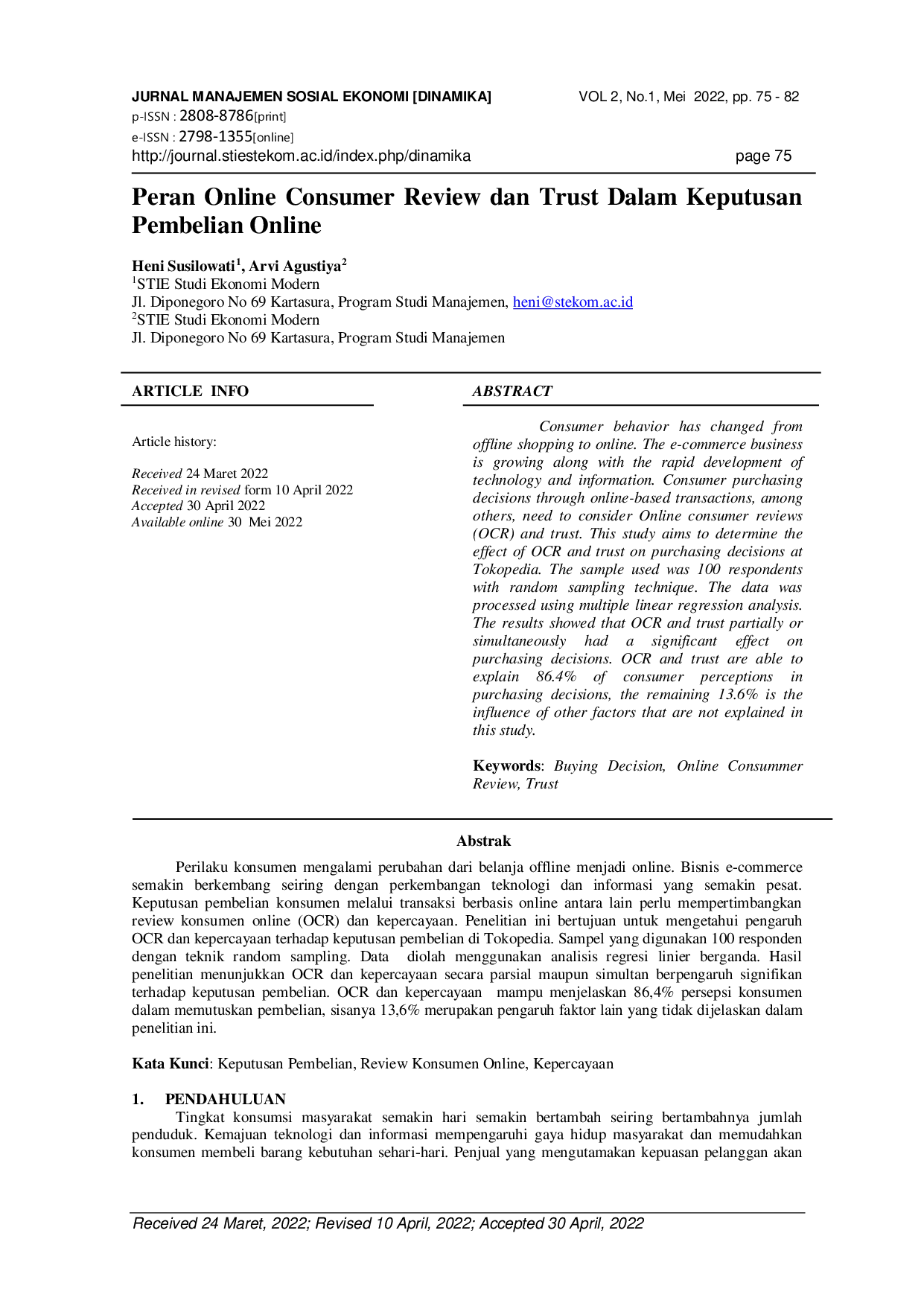 Dinamika: Jurnal Manajemen Sosial EkonomiDinamika: Jurnal Manajemen Sosial EkonomiPerilaku konsumen mengalami perubahan dari belanja offline menjadi online. Bisnis e-commerce semakin berkembang seiring dengan perkembangan teknologi dan informasi yang semakin pesat. Keputusan pembelian konsumen melalui transaksi berbasis online antara lain perlu mempertimbangkan review konsumen online (OCR) dan kepercayaan.