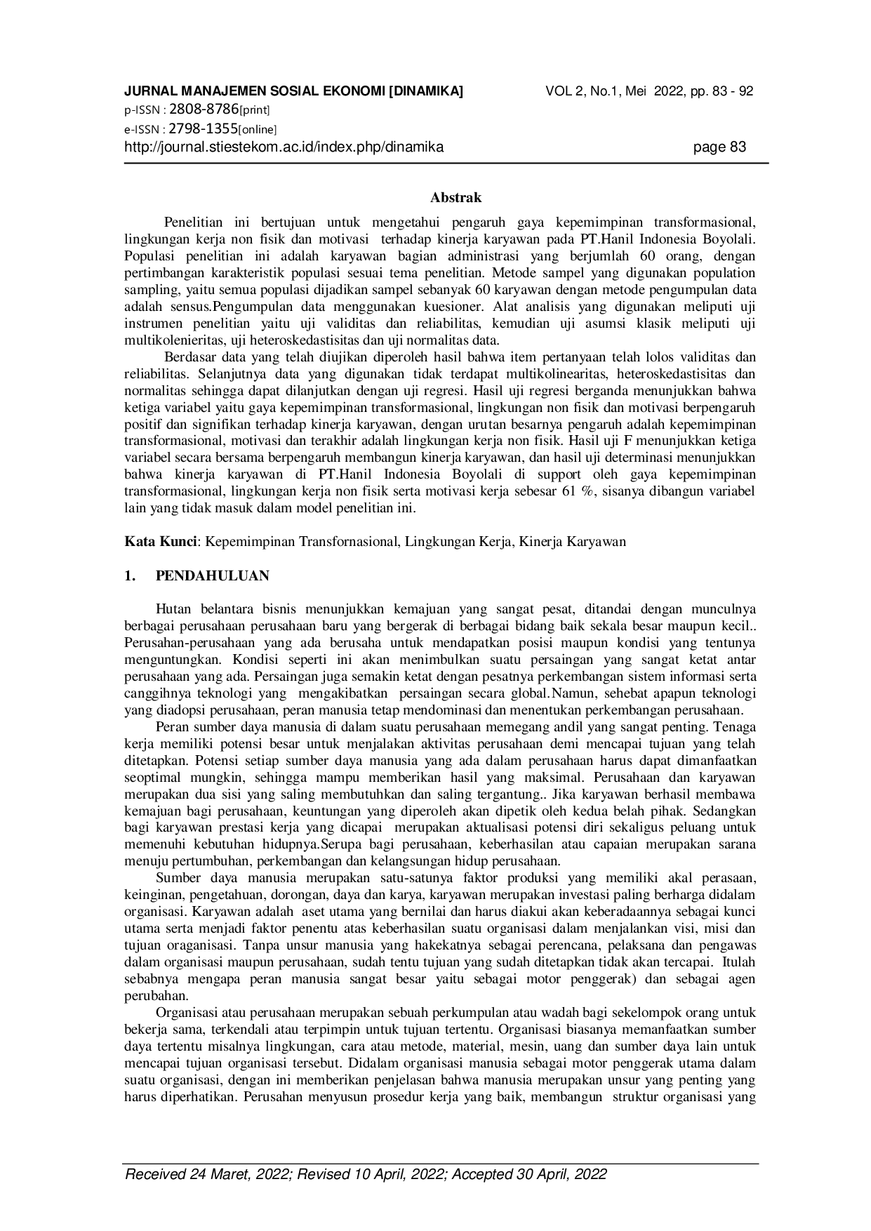 Dinamika: Jurnal Manajemen Sosial EkonomiDinamika: Jurnal Manajemen Sosial EkonomiPenelitian ini bertujuan untuk mengetahui pengaruh gaya kepemimpinan transformasional, lingkungan kerja non fisik, dan motivasi terhadap kinerja karyawan pada PT. Hanil Indonesia Boyolali. Populasi penelitian ini adalah karyawan bagian administrasi yang berjumlah 60 orang, dengan pertimbangan karakteristik populasi sesuai tema penelitian. Metode sampel yang digunakan population sampling, yaitu semua populasi dijadikan sampel sebanyak 60 karyawan dengan metode pengumpulan data adalah sensus. Pengumpulan data menggunakan kuesioner. Alat analisis yang digunakan meliputi uji instrumen penelitian yaitu uji validitas dan reliabilitas, kemudian uji asumsi klasik meliputi uji multikolenieritas, uji heteroskedastisitas dan uji normalitas data. Berdasar data yang telah diujikan diperoleh hasil bahwa item pertanyaan telah lolos validitas dan reliabilitas. Selanjutnya data yang digunakan tidak terdapat multikolinearitas, heteroskedastisitas dan normalitas sehingga dapat dilanjutkan dengan uji regresi. Hasil uji regresi berganda menunjukkan bahwa ketiga variabel yaitu gaya kepemimpinan transformasional, lingkungan non fisik dan motivasi berpengaruh positif dan signifikan terhadap kinerja karyawan, dengan urutan besarnya pengaruh adalah kepemimpinan transformasional, motivasi dan terakhir adalah lingkungan kerja non fisik. Hasil uji F menunjukkan ketiga variabel secara bersama berpengaruh membangun kinerja karyawan, dan hasil uji determinasi menunjukkan bahwa kinerja karyawan di PT. Hanil Indonesia Boyolali di support oleh gaya kepemimpinan transformasional, lingkungan kerja non fisik serta motivasi kerja sebesar 61 %, sisanya dibangun variabel lain yang tidak masuk dalam model penelitian ini.