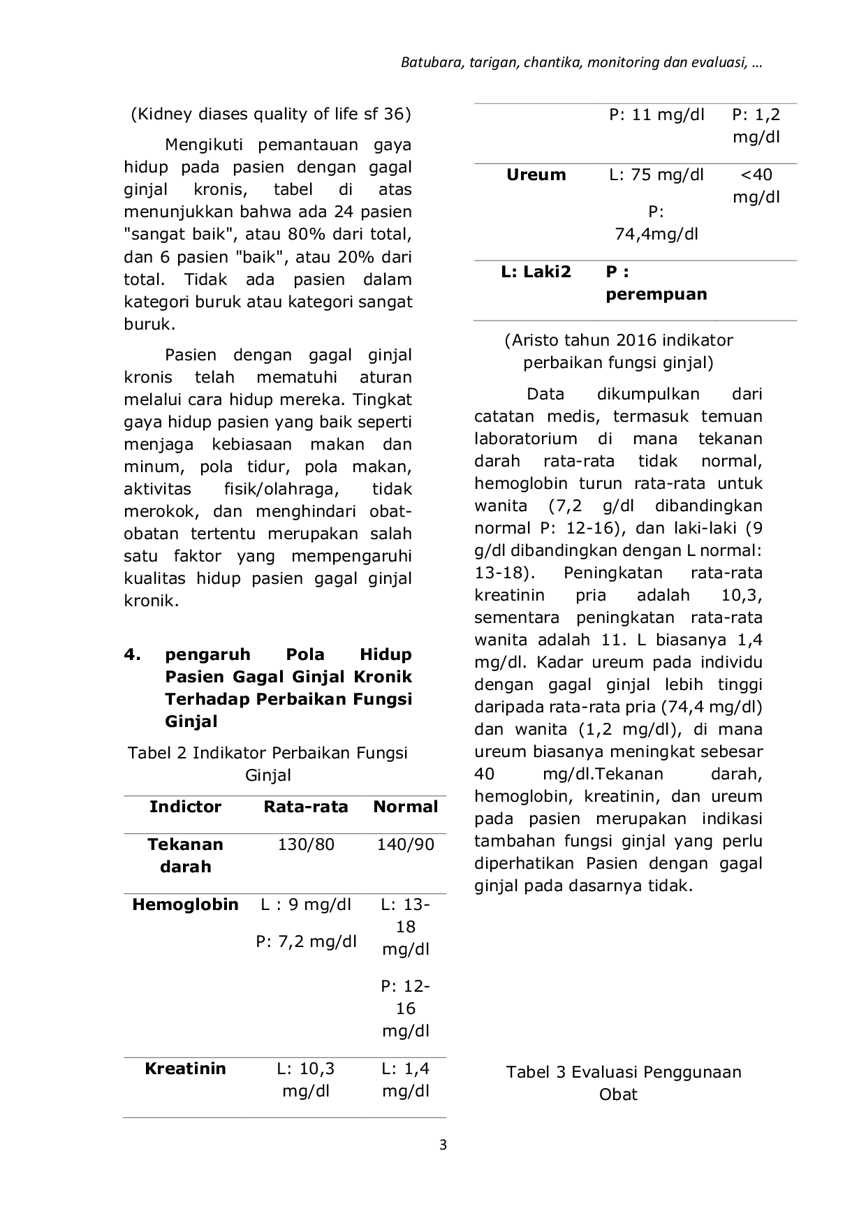 Monitoring Pola Hidup Pasien Gagal Ginjal Kronik. Pasien di RSUD Sembiring Deli Tua hidup sesuai aturan sejak didiagnosa gagal ginjal kronis.Analisis data terdiri dari 30 responden, 24 responden (80%) termasuk dalam kategori memiliki gaya hidup sangat baik, sedangkan 6 responden (20%) termasuk dalam kategori memiliki gaya hidup buruk.b) Pengaruh Pola Hidup Pasien Gagal Ginjal Kronik Terhadap Perbaikan Fungsi Ginjal. Dapat disimpulkan bahwa ada hubungan yang signifikan antara gaya hidup dengan peningkatan fungsi ginjal pada pasien gagal ginjal berdasarkan hasil uji statistik Chi-Square, yang menunjukkan nilai p = 0,001 lebih kecil dari 0,05 yang berarti bahwa Ho ditolak dan Ha diterima.kronis di Ruang Hemodialisis RSUD Sembiring Deli Tua.Evaluasi Penggunaan Obat Pasien Penderita Gagal Ginjal Kronik. a.Nilai sebesar 43,33% diperoleh berdasarkan aspek tepat obat, dan nilai sebesar 56,66% diperoleh berdasarkan tidak tepat obat.Hasilnya berdasarkan aspek tepat indikasi adalah 83,33% dan berdasarkan aspek yang salah indikasi adalah 16,66%.Berdasarkan aspek ketepatan dosis didapatkan hasil 80% benar dan 20% salah.Karakteristik Pasien Gagal Ginjal Kronis Berdasarkan Usia. b.Karakteristik Pasien Gagal Ginjal Kronik Berdasarkan Jenis Kelamin. c.Karakteristik Pasien Gagal Ginjal Kronik Berdasarkan Komplikasi. d.Karakteristik Pasien Gagal Ginjal Kronis Berdasarkan Keluhan Karakteristik Pasien Gagal Ginjal Kronis Berdasarkan Pengobatannya.