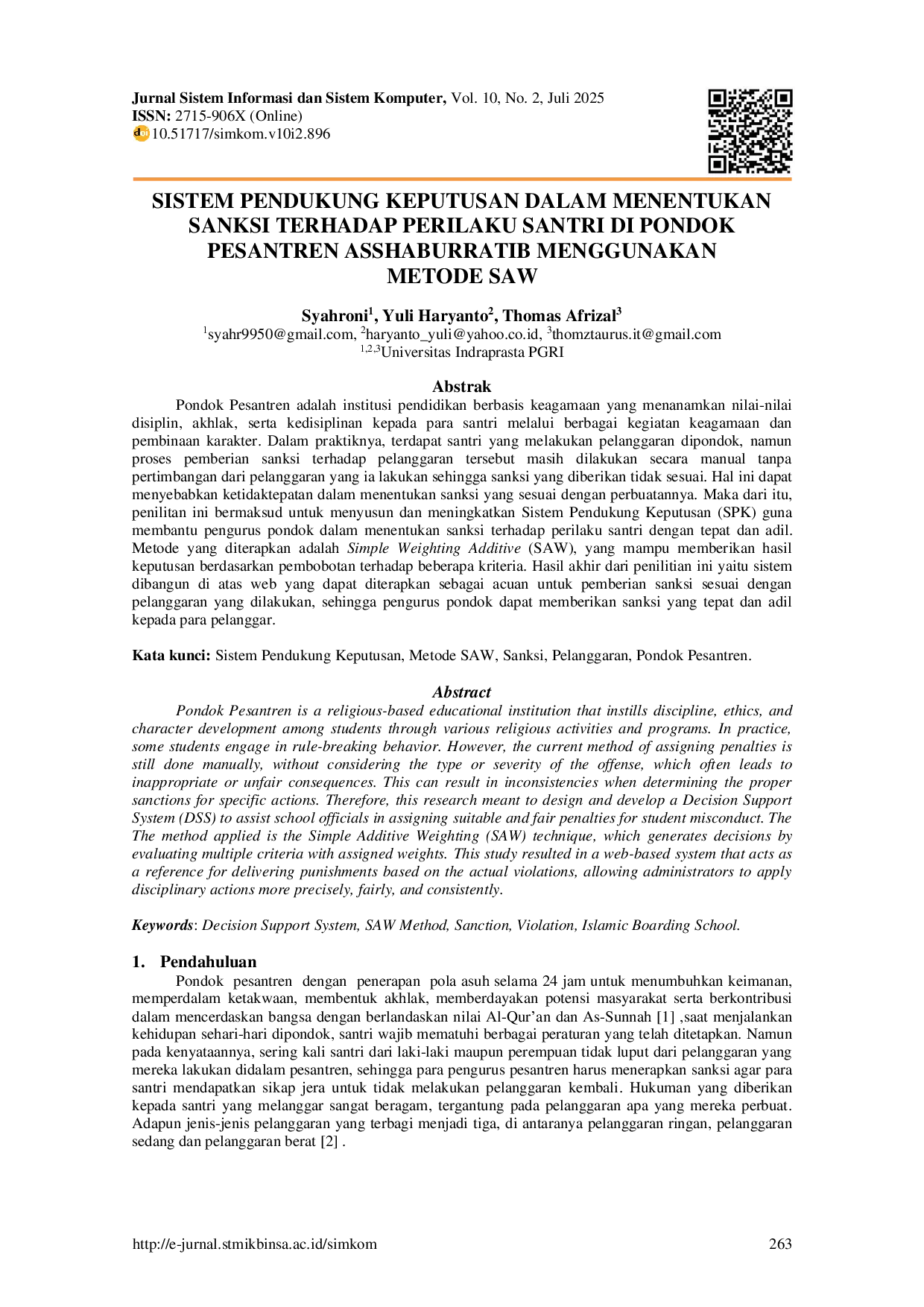 Jurnal Sistem Informasi dan Sistem KomputerJurnal Sistem Informasi dan Sistem KomputerPondok Pesantren adalah institusi pendidikan berbasis keagamaan yang menanamkan nilai-nilai disiplin, akhlak, serta kedisiplinan kepada para santri melalui berbagai kegiatan keagamaan dan pembinaan karakter. Dalam praktiknya, terdapat santri yang melakukan pelanggaran di pondok, namun proses pemberian sanksi terhadap pelanggaran tersebut masih dilakukan secara manual tanpa pertimbangan dari pelanggaran yang ia lakukan sehingga sanksi yang diberikan tidak sesuai. Penelitian ini bermaksud untuk menyusun dan meningkatkan Sistem Pendukung Keputusan (SPK) guna membantu pengurus pondok dalam menentukan sanksi terhadap perilaku santri dengan tepat dan adil menggunakan metode Simple Additive Weighting (SAW), serta menghasilkan sistem berbasis web yang dapat dijadikan acuan pemberian sanksi sesuai dengan pelanggaran yang dilakukan.