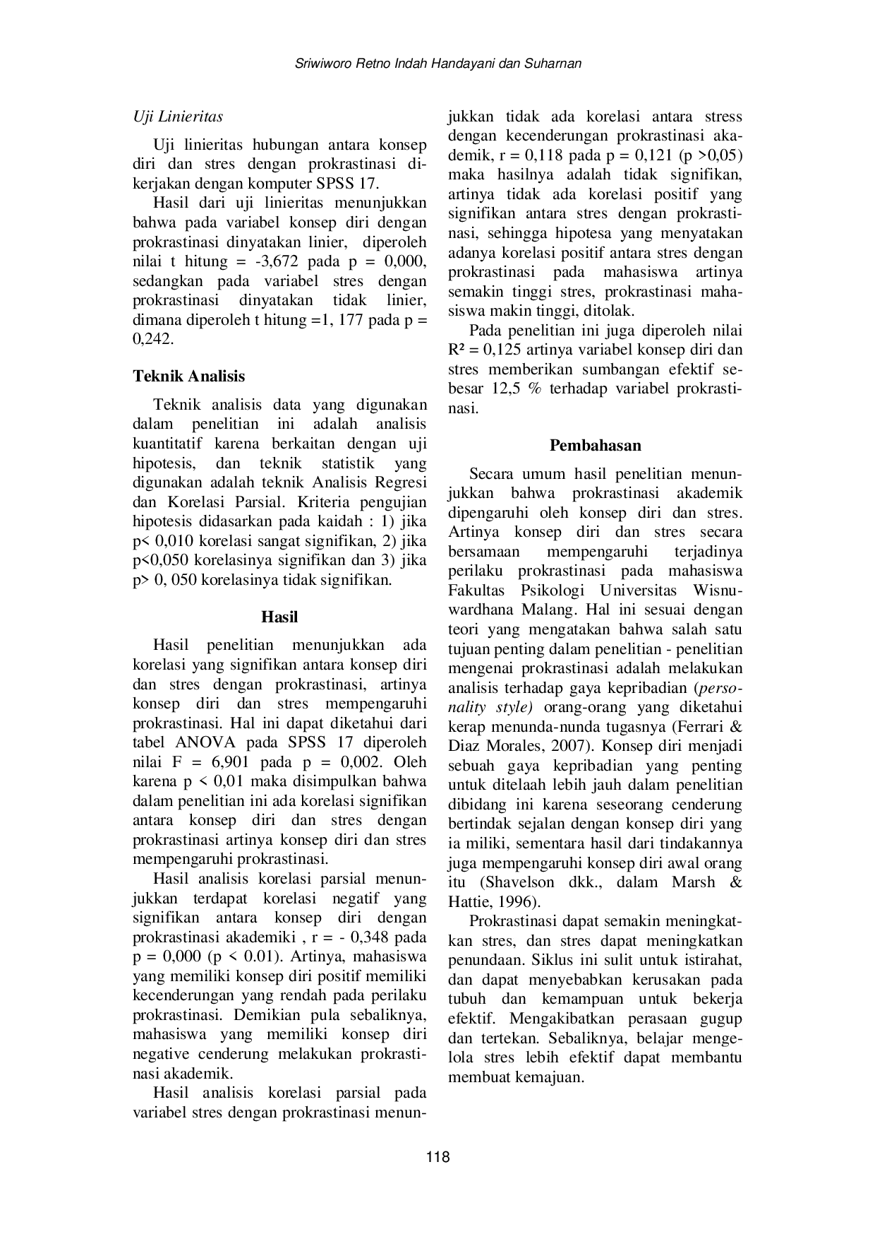 Persona:Jurnal Psikologi IndonesiaPersona:Jurnal Psikologi IndonesiaPenelitian sekarang bertujuan untuk menemukan korelasi antara konsep diri dan stress dengan prokrastinasi akademik pada mahasiswa. Subjek penelitian berjumlah 337 mahasiswa fakultas psikologi Universitas Wisnuwardana. Data penelitian diperoleh melalui skala konsep diri, skala stress dan skala prokrastinasi akademik. Data tersebut dianalisis dengan program SPSS for Windows 17, program regresi kemudian dilanjutkan dengan analisis korelasi parsial. Hasil analisis regresi menunjukkan bahwa konsep diri dan stress berkorelasi dengan prokrastinasi akademik mahasiswa. Hasil analisis korelasi parsial menunjukkan bahwa konsep diri berkorelasi negatif dengan prokrastinasi akademik, sementara yang lain yakni stress tidak berkorelasi dengan prokrastinasi akademik.