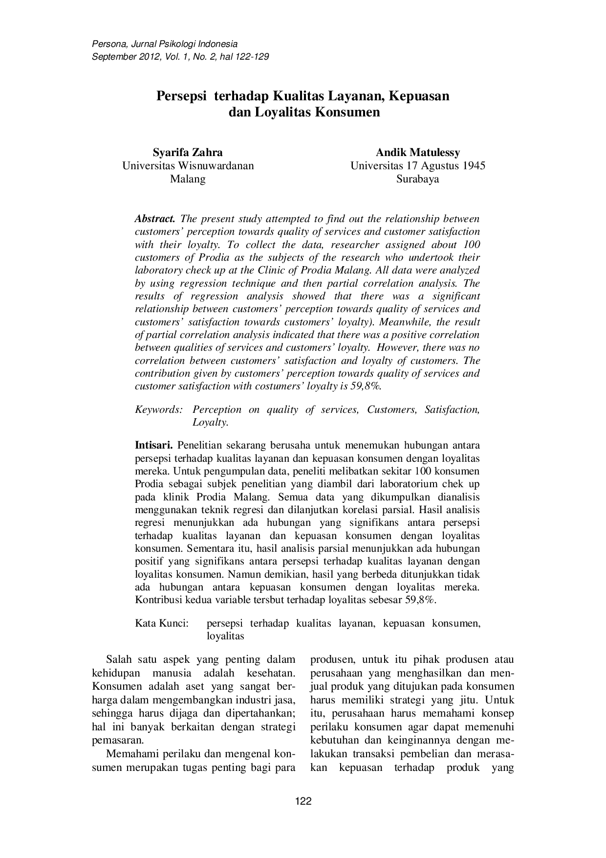 Persona:Jurnal Psikologi IndonesiaPersona:Jurnal Psikologi IndonesiaPenelitian sekarang berusaha untuk menemukan hubungan antara persepsi terhadap kualitas layanan dan kepuasan konsumen dengan loyalitas mereka. Untuk pengumpulan data, peneliti melibatkan sekitar 100 konsumen Prodia sebagai subjek penelitian yang diambil dari laboratorium chek up pada klinik Prodia Malang. Semua data yang dikumpulkan dianalisis menggunakan teknik regresi dan dilanjutkan korelasi parsial. Hasil analisis regresi menunjukkan ada hubungan yang signifikan antara persepsi terhadap kualitas layanan dan kepuasan konsumen dengan loyalitas konsumen. Sementara itu, hasil analisis parsial menunjukkan ada hubungan positif yang signifikan antara persepsi terhadap kualitas layanan dengan loyalitas konsumen. Namun demikian, hasil yang berbeda ditunjukkan tidak ada hubungan antara kepuasan konsumen dengan loyalitas mereka. Kontribusi kedua variabel tersebut terhadap loyalitas sebesar 59,8%.
