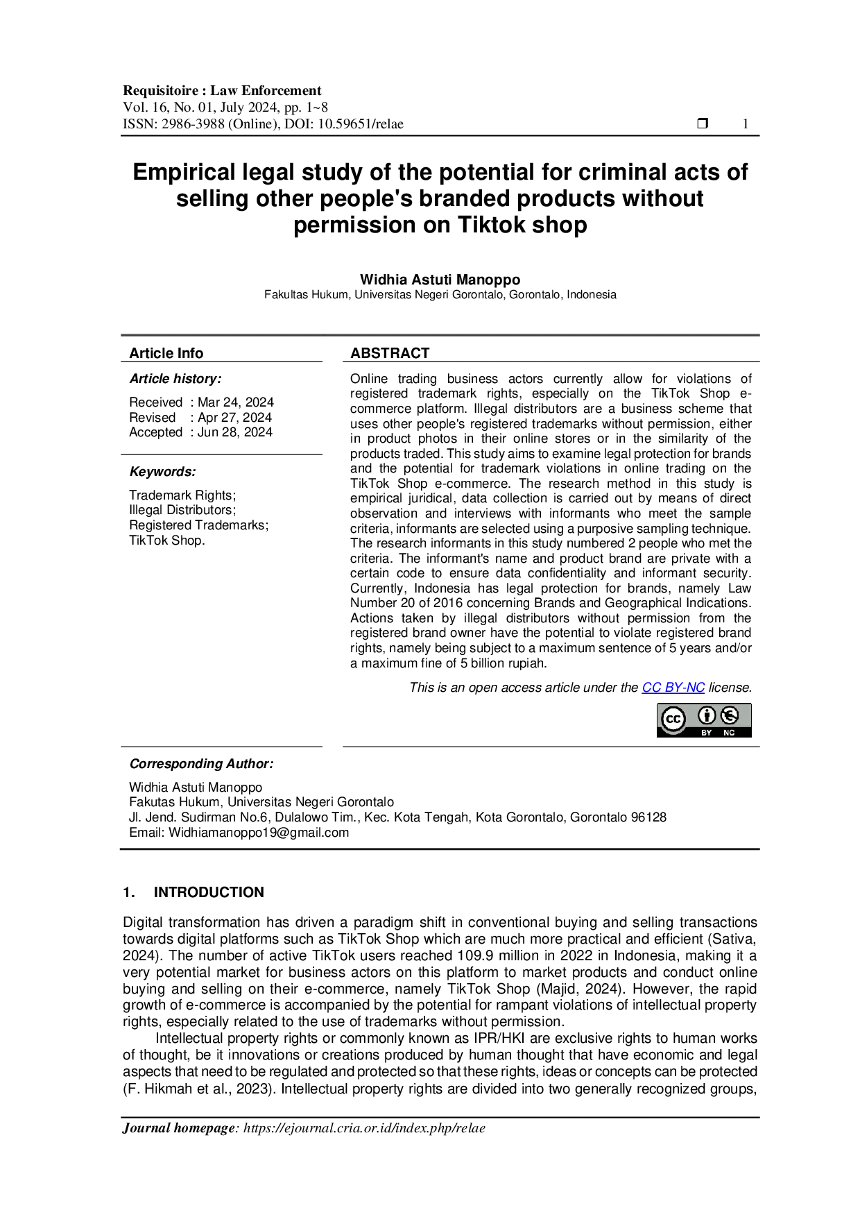 Requisitoire Law EnforcementRequisitoire Law EnforcementOnline trading business actors currently allow for violations of registered trademark rights, especially on the TikTok Shop e-commerce platform. Illegal distributors are a business scheme that uses other peoples registered trademarks without permission, either in product photos in their online stores or in the similarity of the products traded. This study aims to examine legal protection for brands and the potential for trademark violations in online trading on the TikTok Shop e-commerce. The research method in this study is empirical juridical, data collection is carried out by means of direct observation and interviews with informants who meet the sample criteria, informants are selected using a purposive sampling technique. The research informants in this study numbered 2 people who met the criteria. The informants name and product brand are private with a certain code to ensure data confidentiality and informant security. Currently, Indonesia has legal protection for brands, namely Law Number 20 of 2016 concerning Brands and Geographical Indications. Actions taken by illegal distributors without permission from the registered brand owner have the potential to violate registered brand rights, namely being subject to a maximum sentence of 5 years and/or a maximum fine of 5 billion rupiah.