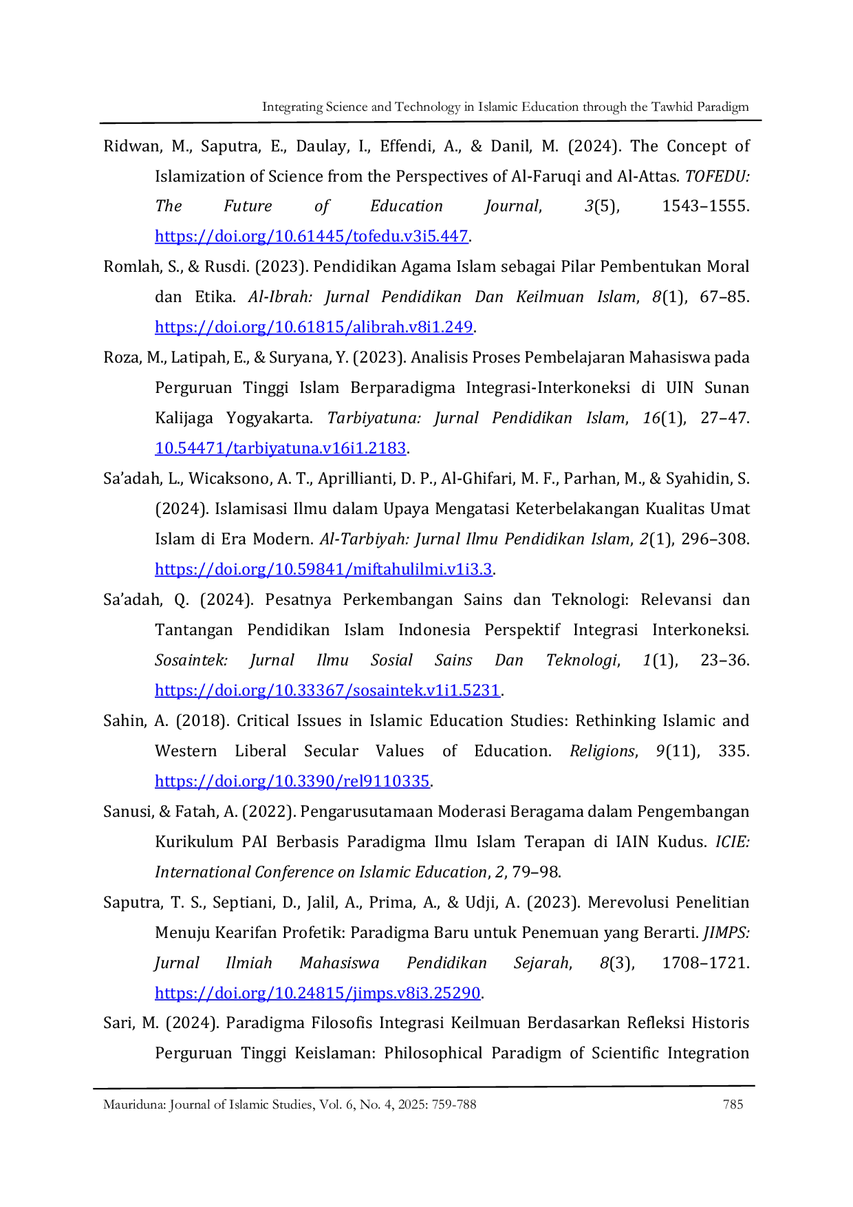 Mauriduna : Journal of Islamic StudiesMauriduna : Journal of Islamic StudiesPenelitian ini membahas implementasi paradigma tauhid sebagai landasan epistemologis untuk mengintegrasikan ilmu pengetahuan dan teknologi dalam pendidikan Islam, dengan tujuan mengatasi dikotomi pengetahuan, fragmentasi ilmu, dan stagnasi kurikulum yang masih banyak terjadi di lembaga pendidikan Islam. Berposisi dalam kerangka epistemologi Islam, penelitian kualitatif ini menggunakan desain studi pustaka dalam paradigma interpretatif. Data diperoleh dari berbagai sumber ilmiah kredibel seperti artikel jurnal, buku, dan prosiding konferensi, kemudian dianalisis secara deskriptif‑kualitatif menggunakan teknik analisis isi model Miles dan Huberman. Hasil penelitian menunjukkan bahwa paradigma tauhid menjadi dasar tiga model integrasi utama, yaitu interkoneksi, Islamisasi ilmu, dan kerangka holistik, yang secara kolektif memperkuat hubungan antara pengetahuan akademik, praktik keilmuan, dan pengembangan karakter spiritual serta moral peserta didik. Penelitian ini mengusulkan pendekatan sintetik yang menekankan penerapan praktis model‑model tersebut secara sistematis dan kontekstual untuk mendorong pembentukan peradaban ilmiah Islam yang berkarakter dan etis. Paradigma tauhid diidentifikasi sebagai landasan strategis untuk membentuk individu yang berpengetahuan, beretika, dan berkemampuan memberikan kontribusi nyata bagi pembangunan masyarakat yang adil, berkeadaban, dan bermanfaat secara luas.
