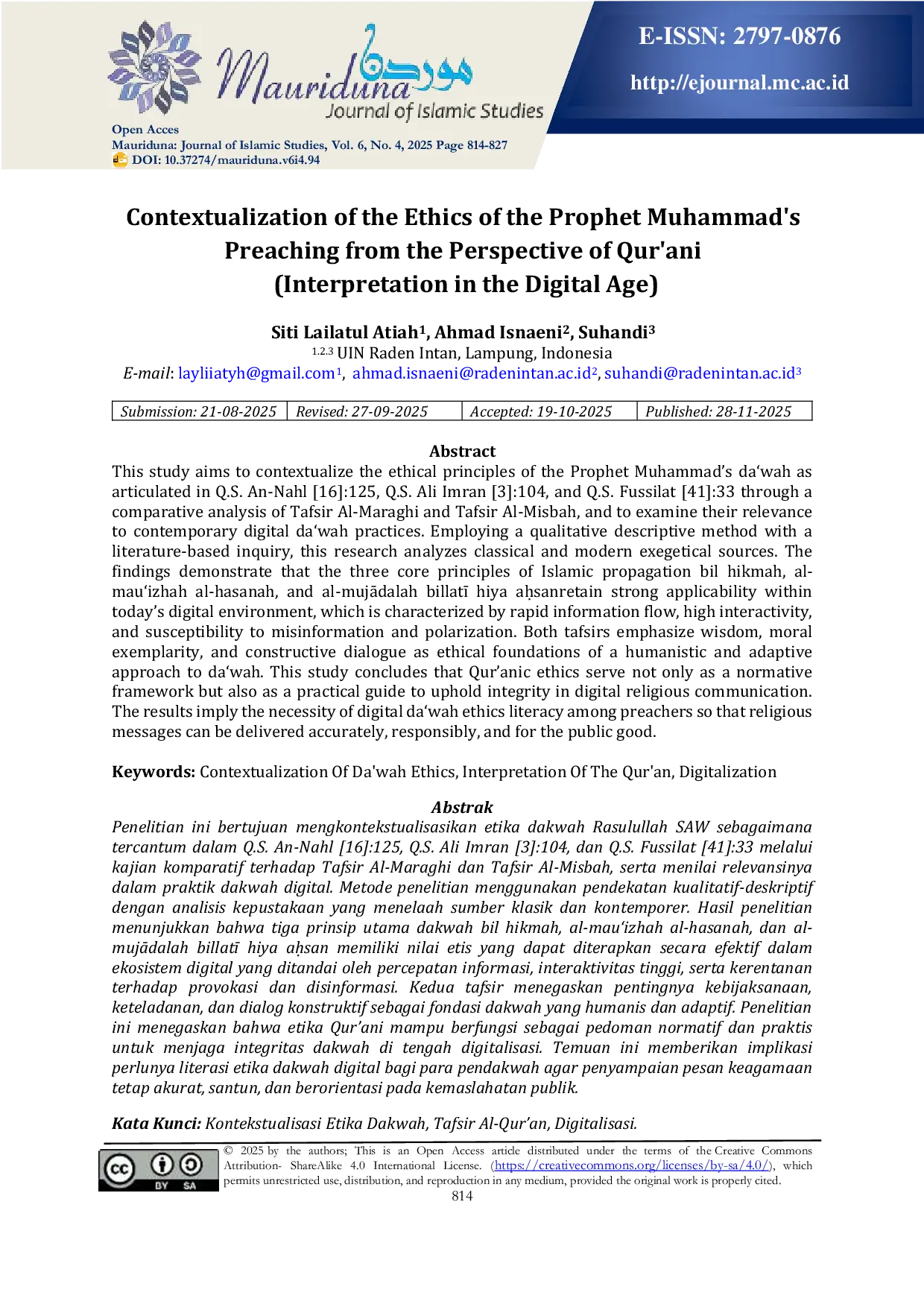 Mauriduna : Journal of Islamic StudiesMauriduna : Journal of Islamic StudiesPenelitian ini bertujuan mengkontekstualisasikan etika dakwah Rasulullah SAW sebagaimana tercantum dalam Q.S. An-Nahl [16]:125, Q.S. Ali Imran [3]:104, dan Q.S. Fussilat [41]:33 melalui kajian komparatif terhadap Tafsir Al-Maraghi dan Tafsir Al-Misbah, serta menilai relevansinya dalam praktik dakwah digital. Metode penelitian menggunakan pendekatan kualitatif-deskriptif dengan analisis kepustakaan yang menelaah sumber klasik dan kontemporer. Hasil penelitian menunjukkan bahwa tiga prinsip utama dakwah bil hikmah, al-mauizhah al-hasanah, dan al-mujādalah billatī hiya aḥsan memiliki nilai etis yang dapat diterapkan secara efektif dalam ekosistem digital yang ditandai oleh percepatan informasi, interaktivitas tinggi, serta kerentanan terhadap provokasi dan disinformasi. Kedua tafsir menegaskan pentingnya kebijaksanaan, keteladanan, dan dialog konstruktif sebagai fondasi dakwah yang humanis dan adaptif. Penelitian ini menegaskan bahwa etika Qurani mampu berfungsi sebagai pedoman normatif dan praktis untuk menjaga integritas dakwah di tengah digitalisasi. Temuan ini memberikan implikasi perlunya literasi etika dakwah digital bagi para pendakwah agar penyampaian pesan keagamaan tetap akurat, santun, dan berorientasi pada kemaslahatan publik.