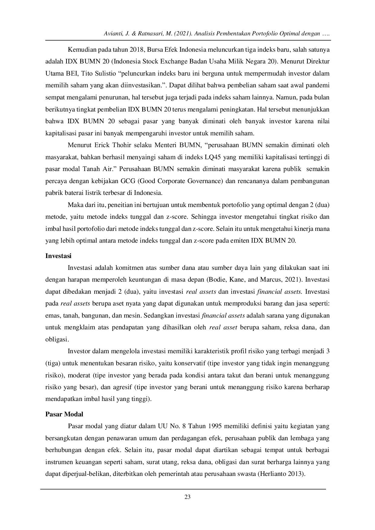 Studi ini berhasil mengidentifikasi portofolio optimal pada emiten IDX BUMN 20 periode Mei 2018 – Desember 2020 melalui tiga metode, yaitu metode indeks tunggal (8 saham), Z-Score growth investing (3 saham), dan Z-Score value investing (3 saham) dengan proporsi dana tertentu.Setiap metode menunjukkan profil imbal hasil dan risiko yang berbeda, di mana metode indeks tunggal menghasilkan imbal hasil 0,001339 dengan risiko 0,0037724, Z-Score growth investing memberikan imbal hasil 0,000989 dengan risiko 0,023369, dan Z-Score value investing menghasilkan imbal hasil 0,001614 dengan risiko 0,027416.Secara keseluruhan, metode Z-Score value investing terbukti memiliki kinerja evaluasi portofolio terbaik, ditunjukkan oleh nilai Sharpe ratio, Treynor measure, dan Jensens alpha yang paling tinggi dibandingkan dua metode lainnya.