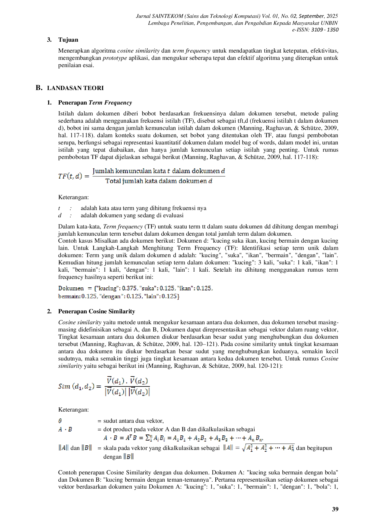 Jurnal SAINTEKOM (Sains dan Teknologi Komputasi)Jurnal SAINTEKOM (Sains dan Teknologi Komputasi)Ujian adalah salah satu bentuk evaluasi pendidikan untuk mengukur kemampuan siswa dalam memahami pelajaran. Esai merupakan salah satu jenis ujian yang menuntut siswa untuk menguraikan jawaban menggunakan kata-katanya sendiri. Penilaian jawaban esai dilakukan dengan cara mencocokkan kemiripan jawaban siswa dengan kunci jawaban. Permasalahan yang terjadi selama melakukan penilaian adalah prosesnya yang memakan waktu yang relatif tidak singkat, adanya kesalahan dalam memberikan poin nilai, dan pemberian nilai yang dilakukan kurang tepat. Perlu adanya pendekatan teknik komputasi untuk memudahkan guru dalam memberikan nilai menggunakan algoritma Term Frequency dan Cosine Similarity. Dengan algoritma tersebut, proses penilaian esai diharapkan mampu meningkatkan tingkat ketepatan dan efektivitas. Proses penilaian ini dilakukan dengan mengukur tingkat kemiripan antara teks jawaban esai dengan teks kunci jawaban berdasarkan frekuensi kemunculan bobot kata jawaban esai dan kunci jawaban. Perhitungan yang diperoleh dari perhitungan algoritma adalah sebagai berikut Kemiripan dengan kunci jawaban siswa sebanyak 10 siswa mendapatkan nilai sebesar 76, 71, 84, 71, 84, 76, 84, 88, 88 dan 71. Pada aplikasi yang dikembangkan telah dilakukan uji kelayakan dari pihak ahli sistem dan diperoleh hasil persentase kelayakan sebesar 100%. Uji pengguna menggunakan kuesioner PSSUQ yang dibagi menjadi empat kategori, di antaranya Secara Keseluruhan sebesar 86.63%, Kegunaan Sistem sebesar 87.67%, Kualitas Informasi sebesar 87.25%, dan Kualitas Antarmuka) sebesar 80.79% yang artinya aplikasi ini “Sangat Layak digunakan. Uji hasil pada algoritma ini menggunakan metode F1-Score yang menghasilkan nilai ketepatan sebesar 0.824 yang dimana termasuk kedalam kategori “baik.