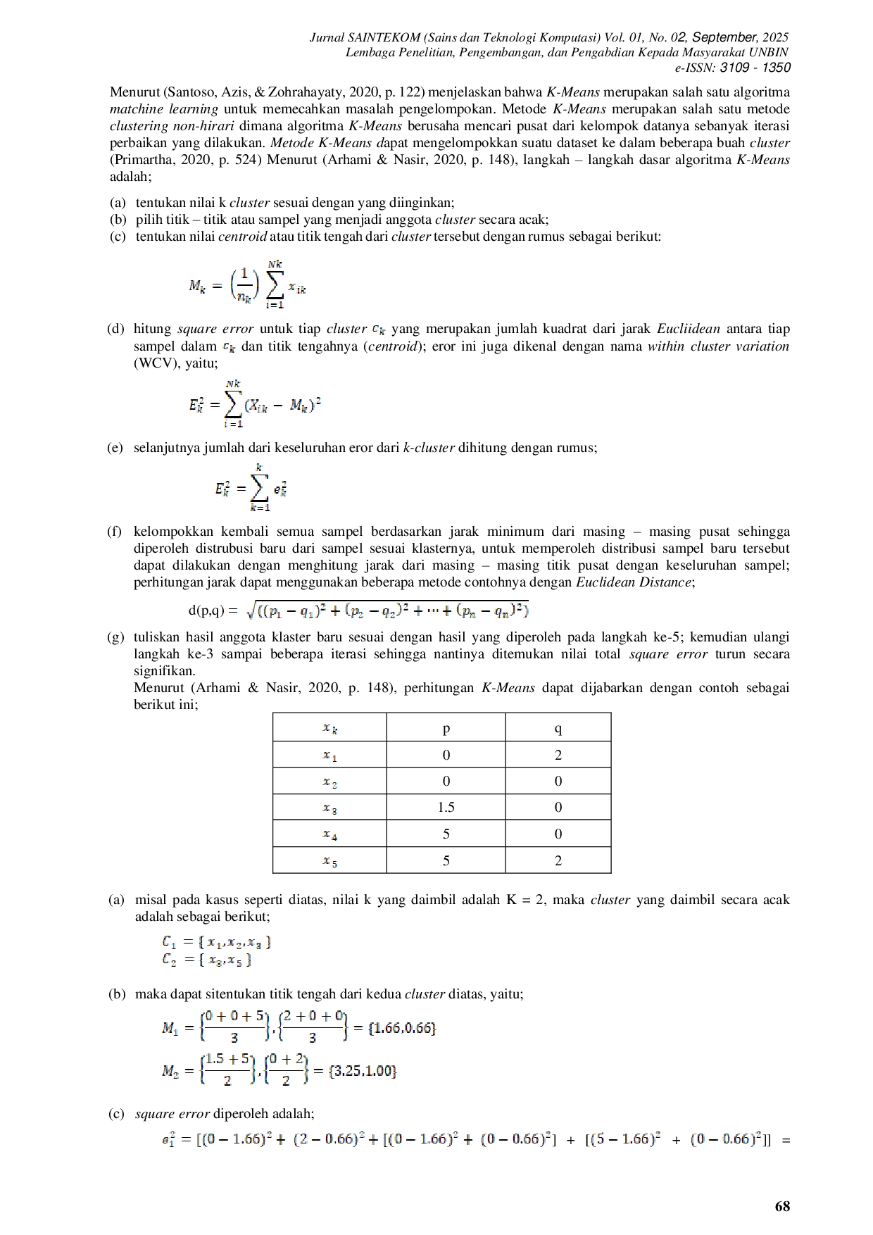 Jurnal SAINTEKOM (Sains dan Teknologi Komputasi)Jurnal SAINTEKOM (Sains dan Teknologi Komputasi)Pemetaan potensi perluasan pasar secara digital marketing terhadap UMKM merupakan pengelompokan UMKM dengan berbagai atribut berdasarkan variabelnya guna membantu pihak terkait dalam menentukan UMKM yang berpotensi diberikan pelatihan digital marketing. Bersarkan pemasalahannya belum diketahui potensi perluasan pasar untuk pemberian pelatihan digital marketing dan belum diketahui efektifnya proses pemetaan potensi perluasan pasar untuk pemberian pelatihan digital marketing. Penelitian ini bertujuan untuk mendapatkan pemetaan potensi perluasan pasar UMKM dan mengukur tingkat efektivitas penerapan algoritma K-Means untuk pemetaan UMKM berdasarkan potensi perluasan pasarnya. Penelitian ini dilaksanakan dengan model Research and Development oleh Borg dan Gall menggunakan algoritma K-Means dengan metode pengembangan prototyping. Klaster yang ditentukan berjumlah 2 sesuai dengan tingkatannya yaitu berpotensi dan tidak berpotensi. Pada aplikasi yang dibangun telah dilakukan uji hasil dengan kuesioner kepada pengguna sebesar 87,9%, yang berarti “sangat layak, serta hasil kuesioner kepada ahli sistem sebesar 100% yang berarti “sangat layak, serta telah dilakukan uji validitas klaster menggunakan silhouette coefficient sebesar 0,80 yang termasuk ke dalam kategori kekuatan klaster “kuat.