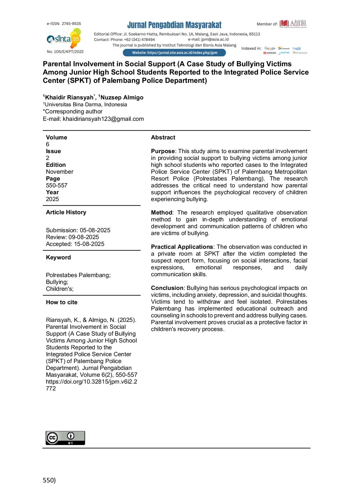 Jurnal Pengabdian MasyarakatJurnal Pengabdian MasyarakatPenelitian ini bertujuan untuk mengkaji keterlibatan orang tua dalam memberikan dukungan sosial kepada korban perundungan di kalangan siswa sekolah menengah pertama yang melaporkan kasus ke Pusat Layanan Polisi Terpadu (SPKT) Polrestabes Palembang. Penelitian ini menjawab kebutuhan kritis untuk memahami bagaimana dukungan orang tua memengaruhi pemulihan psikologis anak-anak yang mengalami perundungan. Penelitian ini menggunakan metode observasi kualitatif untuk mendapatkan pemahaman mendalam tentang perkembangan emosional dan pola komunikasi anak-anak yang menjadi korban perundungan. Observasi dilakukan di ruang pribadi SPKT setelah korban menyelesaikan formulir laporan tersangka, berfokus pada interaksi sosial, ekspresi wajah, respons emosional, dan keterampilan komunikasi sehari-hari. Hasil penelitian menunjukkan bahwa perundungan memiliki dampak psikologis serius pada korban, termasuk kecemasan, depresi, dan pikiran untuk mengakhiri hidup. Polrestabes Palembang telah menerapkan penyuluhan pendidikan dan konseling di sekolah untuk mencegah dan mengatasi kasus perundungan. Keterlibatan orang tua terbukti menjadi faktor pelindung penting dalam proses pemulihan anak-anak.