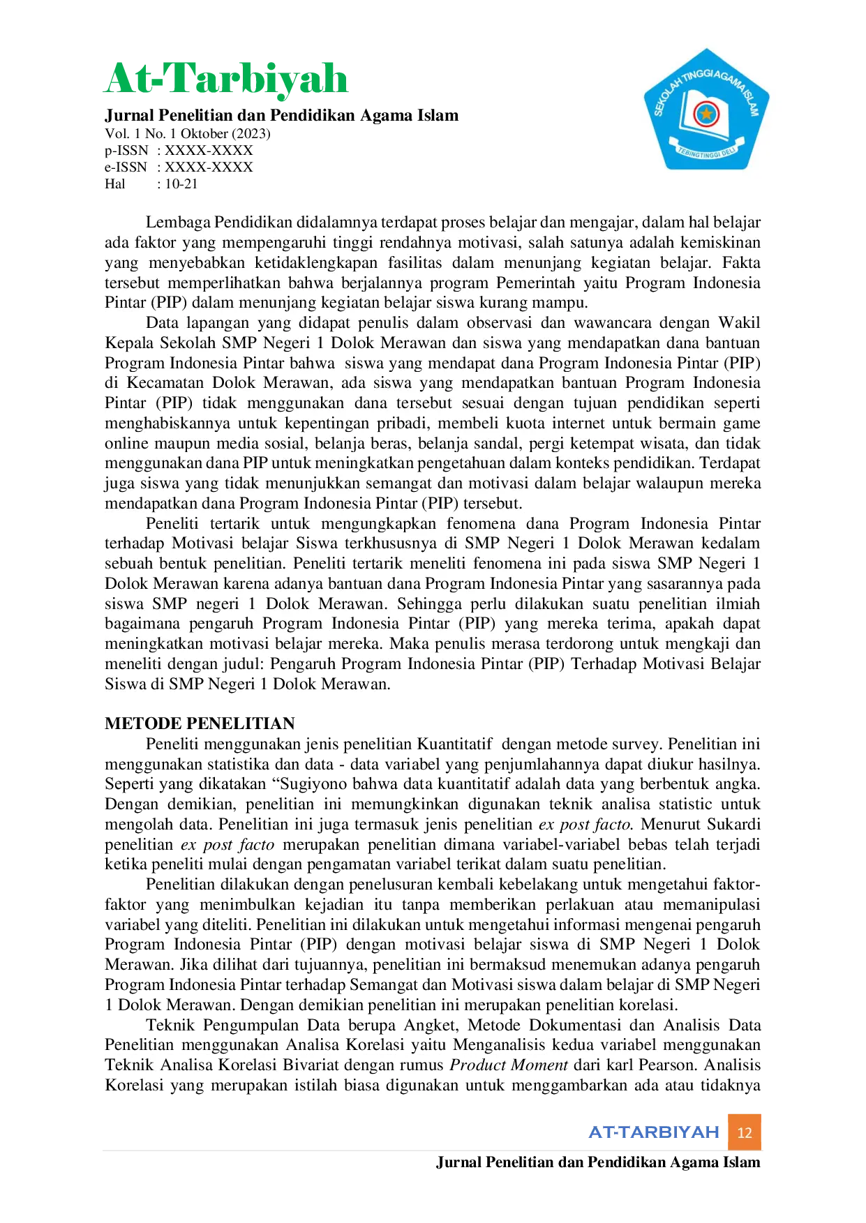 At-Tarbiyah: Jurnal Penelitian dan Pendidikan Agama IslamAt-Tarbiyah: Jurnal Penelitian dan Pendidikan Agama IslamPenelitian ini bertujuan untuk mengetahui motivasi belajar siswa yang menerima Program Indonesia Pintar (PIP) serta pengaruh Program Indonesia Pintar (PIP) terhadap motivasi belajar siswa di SMP Negeri 1 Dolok Merawan. Penelitian ini menggunakan metode kuantitatif. Hasil penelitian menunjukkan bahwa motivasi belajar siswa di SMP Negeri 1 Dolok Merawan cukup tinggi, dan terdapat korelasi positif antara pengaruh Program Indonesia Pintar (PIP) dengan motivasi belajar siswa. Korelasi ini signifikan dengan nilai 0,297. Berdasarkan perhitungan koefisien determinan, pengaruh Program Indonesia Pintar (PIP) terhadap motivasi belajar siswa di SMP Negeri 1 Dolok Merawan adalah 21%, sementara 79% sisanya dipengaruhi oleh variabel lain yang tidak termasuk dalam penelitian ini.