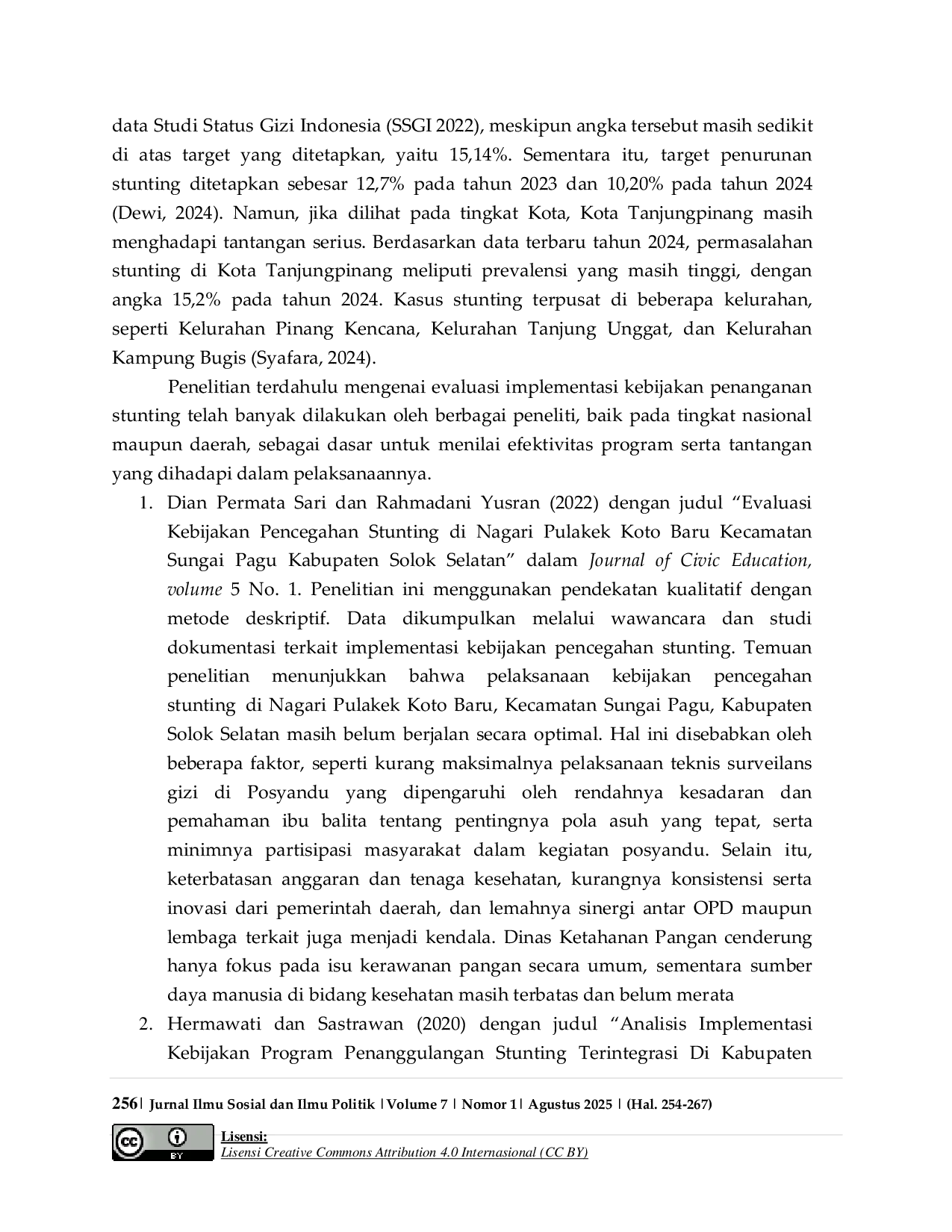 Jurnal Ilmu Sosial dan Ilmu PolitikJurnal Ilmu Sosial dan Ilmu PolitikBerdasarkan data terbaru tahun 2024, permasalahan stunting di Kota Tanjungpinang meliputi prevalensi yang masih tinggi, dengan angka 15,2% pada tahun 2024. Kasus stunting terpusat di beberapa kelurahan, seperti Kelurahan Pinang Kencana, Kelurahan Tanjung Unggat, dan Kelurahan Kampung Bugis. Tujuan dari penelitian ini adalah untuk mengevaluasi implementasi kebijakan penanganan stunting oleh Dinas Kesehatan, Pengendalian Penduduk dan Keluarga Berencana Kota Tanjungpinang. Penelitian ini menggunakan metode studi pustaka (library research) sebagai pendekatan utamanya. Data yang dianalisis merupakan data sekunder, yakni informasi yang dikumpulkan dari berbagai sumber seperti jurnal ilmiah, buku, serta situs web yang memiliki kaitan dengan topik penelitian. Berdasarkan hasil evaluasi implementasi kebijakan penanganan stunting di Kota Tanjungpinang, dapat disimpulkan bahwa program penanganan stunting yang dijalankan oleh Dinas Kesehatan, Pengendalian Penduduk, dan Keluarga Berencana telah menunjukkan kemajuan yang positif. Hal ini ditunjukkan oleh penurunan angka prevalensi stunting dari 15,7% pada tahun 2022 menjadi 15,2% pada tahun 2023.