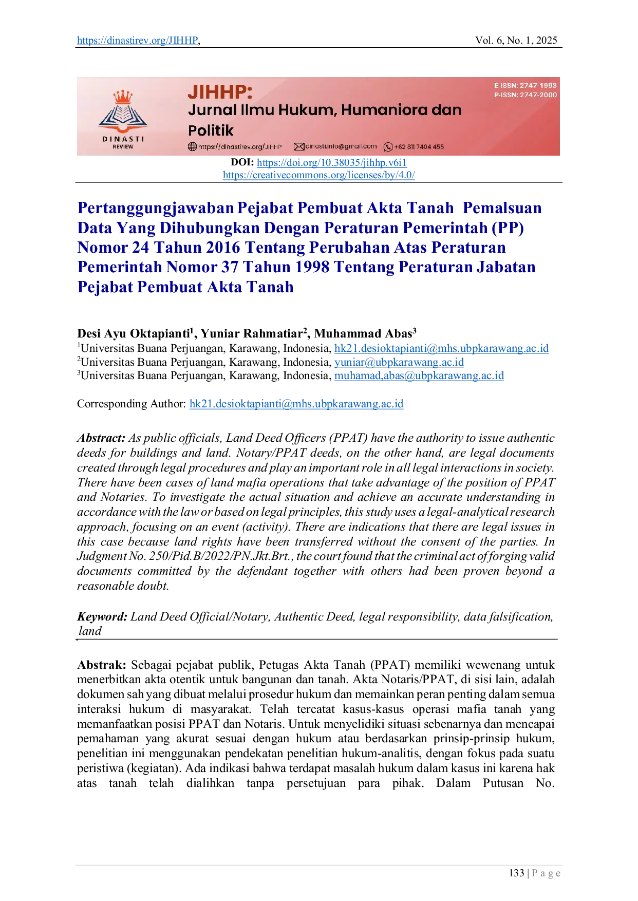 Jurnal Ilmu Hukum, Humaniora dan PolitikJurnal Ilmu Hukum, Humaniora dan PolitikSebagai pejabat publik, Petugas Akta Tanah (PPAT) memiliki wewenang untuk menerbitkan akta otentik untuk bangunan dan tanah. Akta Notaris/PPAT, di sisi lain, adalah dokumen sah yang dibuat melalui prosedur hukum dan memainkan peran penting dalam semua interaksi hukum di masyarakat. Telah tercatat kasus-kasus operasi mafia tanah yang memanfaatkan posisi PPAT dan Notaris. Untuk menyelidiki situasi sebenarnya dan mencapai pemahaman yang akurat sesuai dengan hukum atau berdasarkan prinsip-prinsip hukum, penelitian ini menggunakan pendekatan penelitian hukum-analitis, dengan fokus pada suatu peristiwa (kegiatan). Ada indikasi bahwa terdapat masalah hukum dalam kasus ini karena hak atas tanah telah dialihkan tanpa persetujuan para pihak. Dalam Putusan No. 250/Pid.B/2022/PN.Jkt.Brt., pengadilan menemukan bahwa tindak pidana pemalsuan dokumen sah yang dilakukan oleh terdakwa bersama-sama dengan orang lain telah terbukti secara meyakinkan.