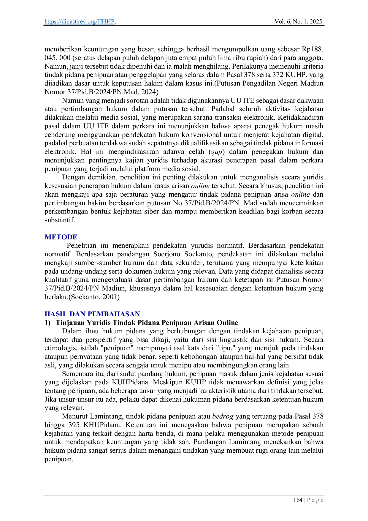 Jurnal Ilmu Hukum, Humaniora dan PolitikJurnal Ilmu Hukum, Humaniora dan PolitikTindak kejahatan penipuan yang terjadi melalui platform digital memerlukan pendekatan hukum yang sesuai dengan perkembangan teknologi informasi. Studi ini mengkaji teori pemidanaan dalam kasus arisan online yang tertuang diputusan No.: 37/Pid. B/2024/PN Madiun. Melalui pengunaan pendekatan yuridis normatif, penelitian ini menilai kecocokan antara dasar hukum yang diterapkan oleh hakim dengan sifat kejahatan yang berbasis elektronik. Temuan penelitian menunjukkan bahwa hakim hanya merujuk di Pasal 378 KUHP tanpa mempertimbangkan ketentuan Pasal 28 ayat (1) UU ITE, meskipun semua tindakan dilakukan melalui media sosial. Ini menggambarkan penerapan hukum yang masih tradisional dan belum beradaptasi dengan jenis kejahatan digital. Namun, kejahatan siber memerlukan penanganan hukum yang lebih peka dan berbasis pada prinsip kepastian serta perlindungan hukum. Temuan ini menekankan pentingnya pembaruan pemahaman para penegak hukum terhadap tindak pidana yang memanfaatkan teknologi digital.