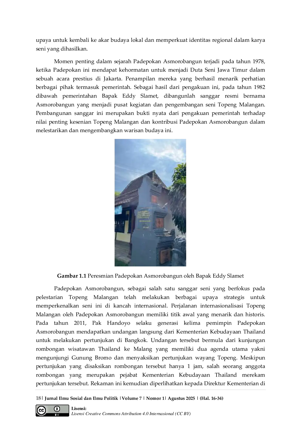 Jurnal Ilmu Sosial dan Ilmu PolitikJurnal Ilmu Sosial dan Ilmu PolitikPenelitian ini mendeskripsikan strategi internasionalisasi Topeng Malangan yang diterapkan oleh padepokan Asmorobangun dalam konteks partisipasinya pada International Mask Festival (IMF) tahun 2023. Permasalahan utama penelitian ini berfokus pada Bagaimana seni tradisional Topeng Malangan dapat beradaptasi dan diterima di kancah internasional tanpa kehilangan nilai-nilai otentiknya, dengan argumen bahwa strategi adaptasi yang tepat mampu mempertahankan esensi budaya lokal sekaligus menarik minat penonton global. Menggunakan pendekatan kualitatif dengan metode studi kasus, hasil penelitian menunjukkan bahwa Padepokan Asmorobangun menerapkan beberapa strategi utama yang adaptif dalam internasionalisasi, meliputi: penyederhanaan durasi pertunjukan dari 9-10 jam menjadi 10 menit tanpa menghilangkan esensi otentik, pengurangan penggunaan bahasa verbal, penekanan pada pola karakter penokohan melalui gerakan dan ekspresi yang diintensifkan, serta pemilihan cerita Sayembara Adu Jago yang memiliki nilai universal. Meskipun menghadapi tantangan signifikan dalam aspek pendanaan dan keterbatasan waktu persiapan, partisipasi dalam International Mask Festival (IMF) 2023 telah memberikan dampak positif berupa perluasan jaringan kerjasama internasional dan peningkatan reputasi Padepokan Asmorobangun di kancah global. Penelitian ini menyimpulkan bahwa festival internasional dapat menjadi platform strategis dalam diplomasi budaya dan internasionalisasi seni tradisional, dengan kemampuan adaptasi dan inovasi menjadi faktor kunci keberhasilan dalam memperkenalkan warisan budaya lokal ke panggung global tanpa kehilangan pakem-pakem yang menjadi elemen dasar Topeng Malangan.