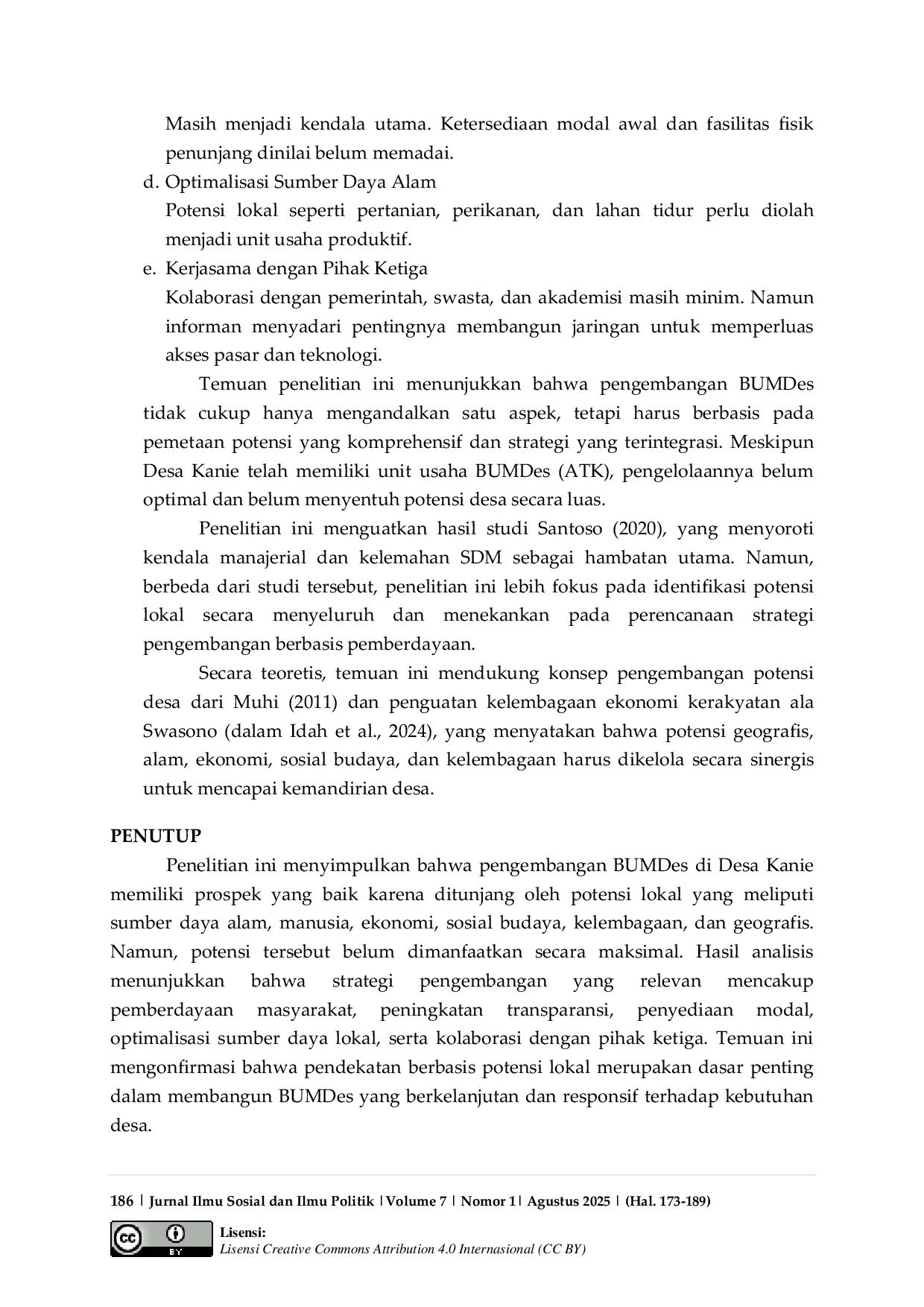 Penelitian ini menyimpulkan bahwa pengembangan BUMDes di Desa Kanie memiliki prospek yang baik karena ditunjang oleh potensi lokal yang meliputi sumber daya alam, manusia, ekonomi, sosial budaya, kelembagaan, dan geografis.Namun, potensi tersebut belum dimanfaatkan secara maksimal.Strategi pengembangan yang relevan mencakup pemberdayaan masyarakat, peningkatan transparansi, penyediaan modal, optimalisasi sumber daya lokal, serta kolaborasi dengan pihak ketiga.Pendekatan berbasis potensi lokal merupakan dasar penting dalam membangun BUMDes yang berkelanjutan dan responsif terhadap kebutuhan desa.