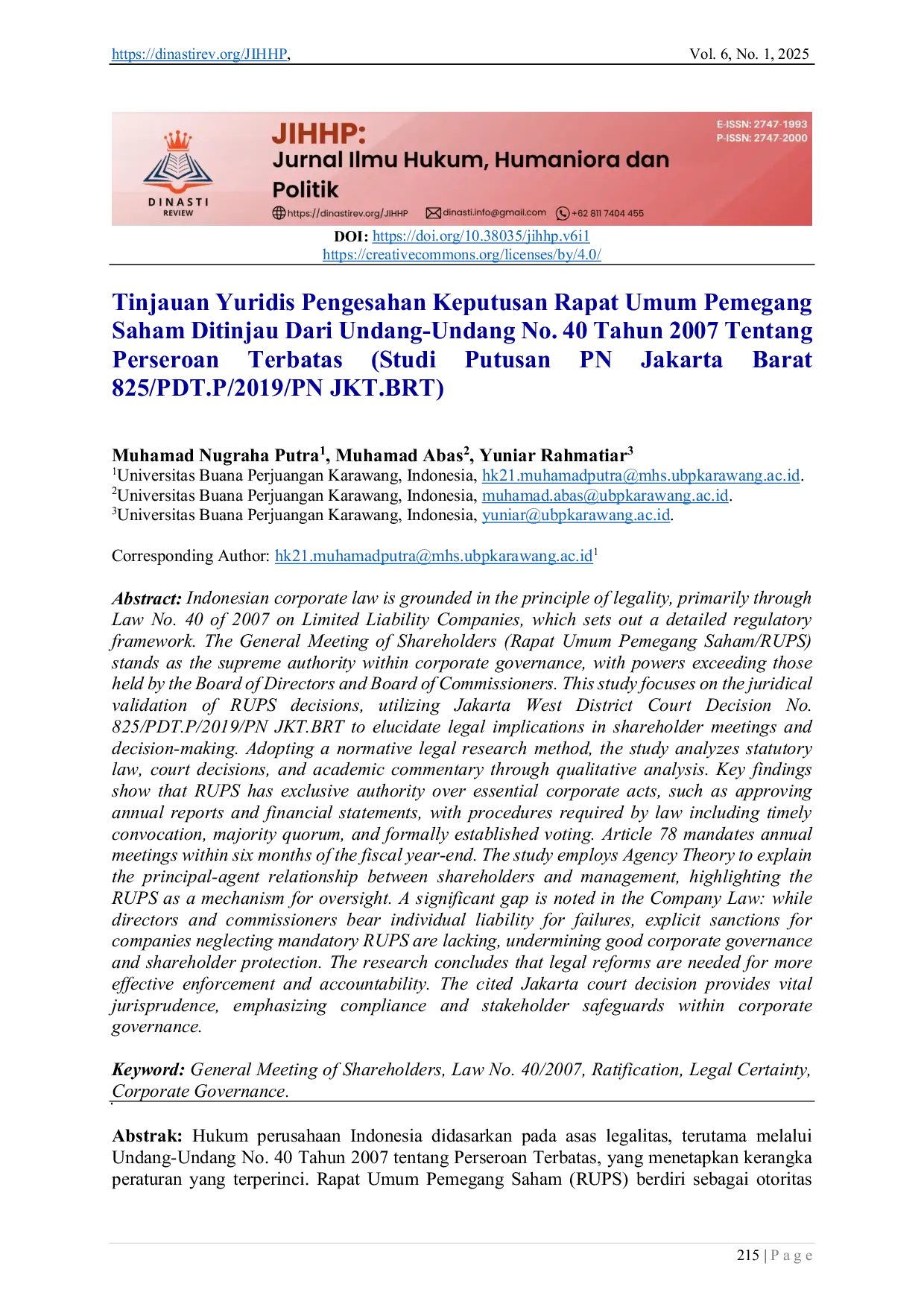 Jurnal Ilmu Hukum, Humaniora dan PolitikJurnal Ilmu Hukum, Humaniora dan PolitikHukum perusahaan Indonesia didasarkan pada asas legalitas, terutama melalui Undang-Undang No. 40 Tahun 2007 tentang Perseroan Terbatas, yang menetapkan kerangka peraturan yang terperinci. Rapat Umum Pemegang Saham (RUPS) berdiri sebagai otoritas tertinggi dalam tata kelola perusahaan, dengan kekuasaan yang melebihi yang dipegang oleh Dewan Direksi dan Dewan Komisaris. Studi ini berfokus pada validasi yuridis keputusan RUPS, memanfaatkan Putusan Pengadilan Negeri Jakarta Barat No. 825/PDT.P/2019/PN JKT.BRT untuk menjelaskan implikasi hukum dalam rapat pemegang saham dan pengambilan keputusan. Mengadopsi metode penelitian hukum normatif, penelitian ini menganalisis hukum perundang-undangan, keputusan pengadilan, dan komentar akademis melalui analisis kualitatif. Temuan utama menunjukkan bahwa RUPS memiliki wewenang eksklusif atas tindakan perusahaan yang penting, seperti menyetujui laporan tahunan dan laporan keuangan, dengan prosedur yang diwajibkan oleh hukum termasuk pemanggilan tepat waktu, kuorum mayoritas, dan pemungutan suara yang ditetapkan secara resmi. Pasal 78 mengamanatkan rapat tahunan dalam waktu enam bulan setelah akhir tahun fiskal. Studi ini menggunakan Teori Keagenan untuk menjelaskan hubungan principal-agent antara pemegang saham dan manajemen, dengan menyoroti RUPS sebagai mekanisme pengawasan. Terdapat kesenjangan yang signifikan dalam Undang-Undang Perseroan Terbatas: meskipun direksi dan komisaris bertanggung jawab secara individual atas kegagalan, sanksi eksplisit bagi perusahaan yang mengabaikan RUPS wajib masih kurang, sehingga melemahkan tata kelola perusahaan yang baik dan perlindungan pemegang saham. Penelitian ini menyimpulkan bahwa reformasi hukum diperlukan untuk penegakan hukum dan akuntabilitas yang lebih efektif. Putusan pengadilan Jakarta yang dikutip memberikan yurisprudensi penting, yang menekankan kepatuhan dan perlindungan pemangku kepentingan dalam tata kelola perusahaan.
