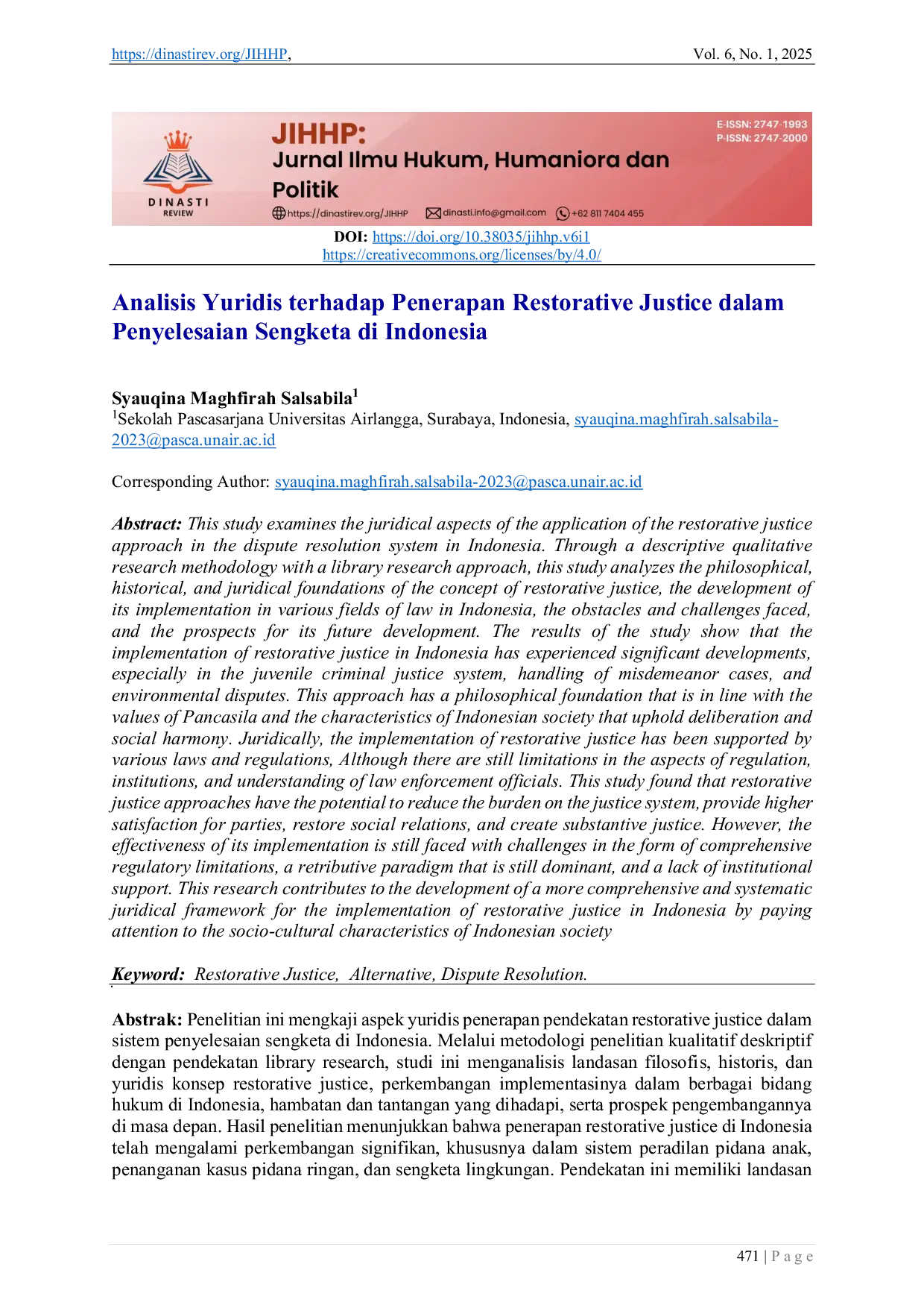 Jurnal Ilmu Hukum, Humaniora dan PolitikJurnal Ilmu Hukum, Humaniora dan PolitikPenelitian ini mengkaji aspek yuridis penerapan pendekatan restorative justice dalam sistem penyelesaian sengketa di Indonesia. Melalui metodologi penelitian kualitatif deskriptif dengan pendekatan library research, studi ini menganalisis landasan filosofis, historis, dan yuridis konsep restorative justice, perkembangan implementasinya dalam berbagai bidang hukum di Indonesia, hambatan dan tantangan yang dihadapi, serta prospek pengembangannya di masa depan. Hasil penelitian menunjukkan bahwa penerapan restorative justice di Indonesia telah mengalami perkembangan signifikan, khususnya dalam sistem peradilan pidana anak, penanganan kasus pidana ringan, dan sengketa lingkungan. Pendekatan ini memiliki landasan filosofis yang sejalan dengan nilai-nilai Pancasila dan karakteristik masyarakat Indonesia yang menjunjung tinggi musyawarah dan harmoni sosial. Secara yuridis, implementasi restorative justice telah didukung oleh berbagai peraturan perundang-undangan, meskipun masih terdapat keterbatasan dalam aspek regulasi, kelembagaan, dan pemahaman aparat penegak hukum. Penelitian ini menemukan bahwa pendekatan restorative justice berpotensi mengurangi beban sistem peradilan, memberikan kepuasan lebih tinggi bagi para pihak, memulihkan hubungan sosial, dan menciptakan keadilan substantif. Namun demikian, efektivitas penerapannya masih dihadapkan pada tantangan berupa keterbatasan regulasi yang komprehensif, paradigma retributif yang masih dominan, dan kurangnya dukungan kelembagaan. Penelitian ini memberikan kontribusi bagi pengembangan kerangka yuridis penerapan restorative justice di Indonesia yang lebih komprehensif dan sistematis dengan memperhatikan karakteristik sosio-kultural masyarakat Indonesia.