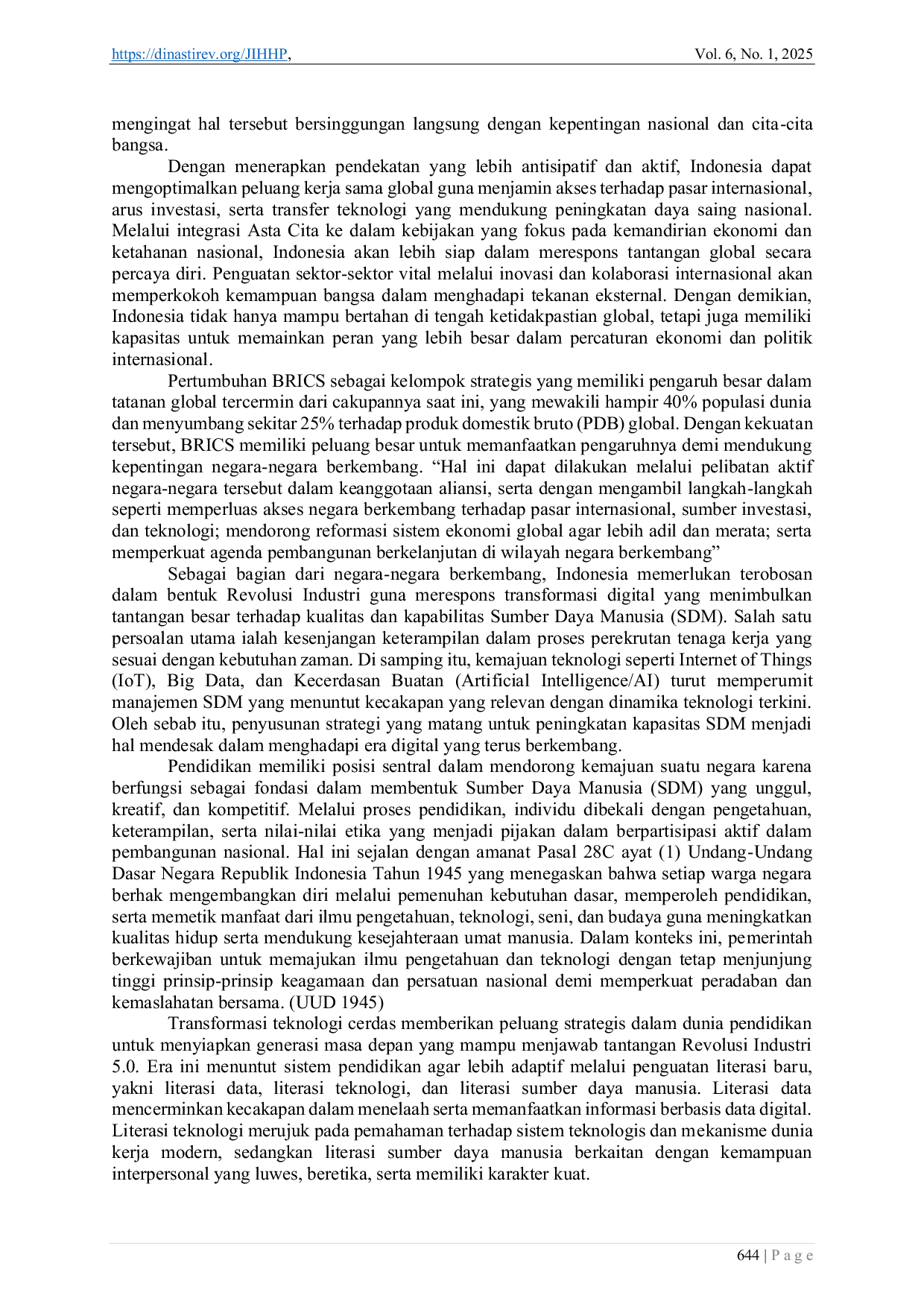 Penataan pendidikan nasional di era Society 5.0 melalui Pembelajaran Berbasis Teknologi Cerdas (robotika, pemrograman, AI) bertujuan meningkatkan kreativitas dan inovasi peserta didik.Pengajar harus menguasai keterampilan teknologi cerdas, sementara keanggotaan Indonesia dalam BRICS membuka peluang strategis untuk menjadikan Indonesia sebagai aktor kunci ekonomi global dengan SDM kompetitif.Dengan mengatasi tantangan pendidikan modern, ilmu hukum dapat berperan proaktif memastikan keadilan, perlindungan hak fundamental, dan ketertiban hukum dalam masyarakat yang semakin terdigitalisasi.