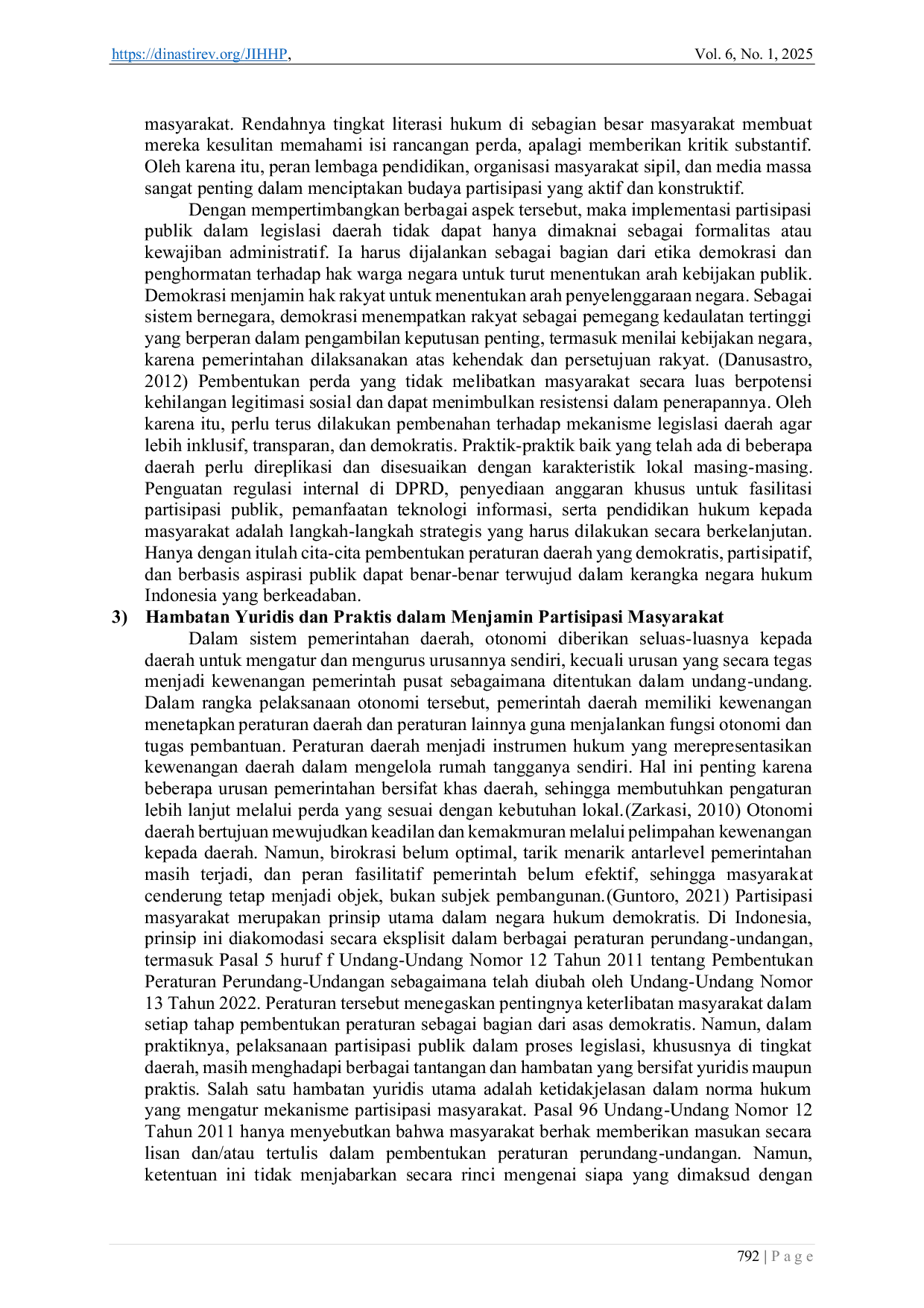 Jurnal Ilmu Hukum, Humaniora dan PolitikJurnal Ilmu Hukum, Humaniora dan PolitikPembentukan peraturan daerah merupakan wujud konkret pelaksanaan otonomi daerah dalam negara hukum yang demokratis. Salah satu asas penting dalam proses legislasi adalah asas demokratis yang mengharuskan adanya partisipasi publik dalam setiap tahapan pembentukan peraturan. Penelitian ini bertujuan untuk menganalisis penerapan asas demokratis dalam pembentukan perda serta mengidentifikasi kendala yang menghambat keterlibatan masyarakat secara substansial. Metode yang digunakan adalah penelitian hukum normatif dengan pendekatan perundang-undangan dan konseptual. Hasil penelitian menunjukkan bahwa pelaksanaan asas demokratis dalam pembentukan perda masih belum optimal. Masyarakat sering kali tidak dilibatkan secara aktif, konsultasi publik bersifat formalitas, dan mekanisme akuntabilitas belum berjalan efektif. Hambatan struktural dan kultural turut memperkuat lemahnya partisipasi publik. Penelitian ini menyimpulkan bahwa perlu adanya penguatan regulasi teknis, komitmen politik, dan edukasi hukum agar prinsip demokratis benar-benar terwujud dalam legislasi daerah.