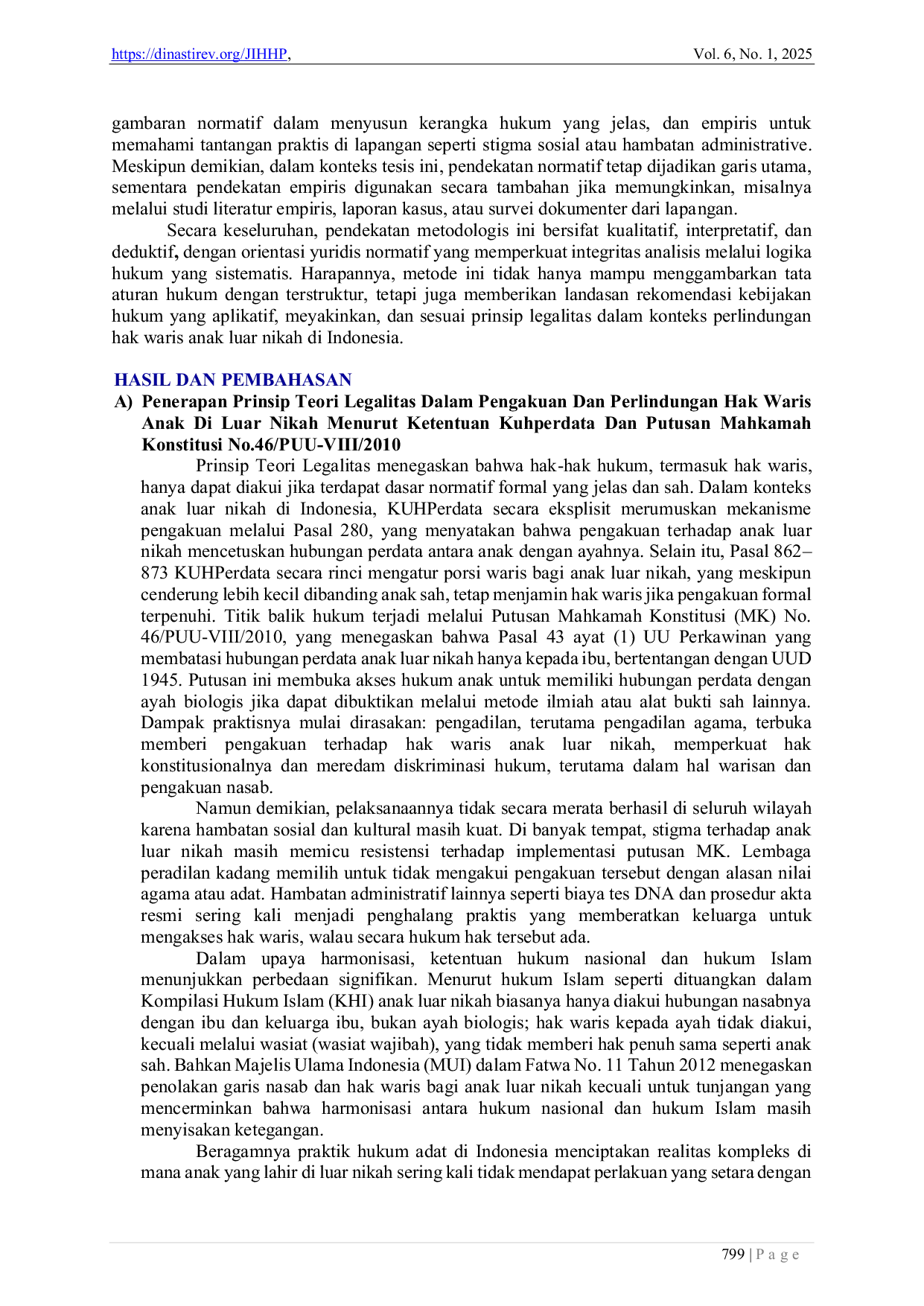 Jurnal Ilmu Hukum, Humaniora dan PolitikJurnal Ilmu Hukum, Humaniora dan PolitikPenelitian ini bertujuan menganalisis perlindungan hukum terhadap hak waris anak yang lahir di luar perkawinan melalui perspektif Teori Legalitas, yaitu prinsip bahwa setiap tindakan dan perlakuan hukum harus memiliki dasar ketentuan formal dan jelas. Fokus utama adalah pada keberlakuan Pasal 280 KUHPerdata serta Putusan Mahkamah Konstitusi Nomor 46/PUU-VIII/2010 sebagai landasan hukum pengakuan hubungan perdata antara anak luar nikah dan ayah biologisnya. Metode penelitian yang digunakan adalah yuridis-normatif dengan pendekatan deskriptif-analitis terhadap peraturan hukum dan doktrin. Sumber data meliputi bahan hukum primer (seperti KUHPerdata dan putusan MK), bahan sekunder (literatur hukum dan artikel ilmiah), serta bahan tersier (pendapat ahli dan buku hukum). Hasil penelitian menunjukkan bahwa prinsip Teori Legalitas menuntut bahwa hak waris anak luar nikah dapat dilindungi apabila ada pengakuan formal secara hukum, sesuai ketentuan pasal dan putusan yudikatif. Meskipun terdapat dasar hukum yang memberi ruang bagi pengakuan dan akses hak waris, implementasinya sering terkendala oleh minimnya kesadaran hukum masyarakat, resistensi budaya, serta hambatan administratif. Oleh karena itu, dibutuhkan penguatan regulasi formal dan sosialisasi yang efektif agar prinsip legalitas dapat terealisasi secara adil dan konsisten. Penelitian ini diharapkan memperkuat kerangka normatif bagi perlindungan anak luar nikah dalam hukum perdata Indonesia sekaligus memberikan rekomendasi kebijakan untuk memperbaiki implementasi hukum di lapangan.