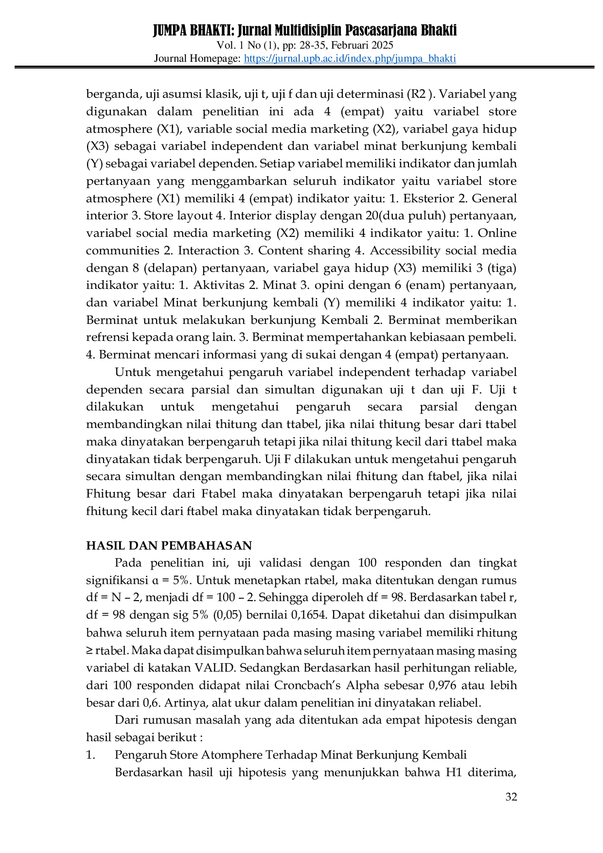 JUMPA BHAKTI : (JURNAL MULTIDISIPLIN PASCASARJANA) BHAKTIJUMPA BHAKTI : (JURNAL MULTIDISIPLIN PASCASARJANA) BHAKTIPenelitian ini bertujuan untuk mengetahui pengaruh store atmosphere terhadap minat berkunjung kembali, untuk mengetahui pengaruh social media marketing terhadap minat berkunjung kembali, untuk mengetahui pengaruh gaya hidup terhadap minat berkunjung kembali dan untuk mengetahui pengaruh store atmosphere, social media marketing dan gaya hidup terhadap minat berkunjung kembali konsumen Gen Z di CW Coffee Pontianak. Dalam metode penelitian, penulis menggunakan metode kuantitatif bersifat deskriptif dengan teknik pengumpulan data melalui observasi, wawancara dan kuesioner. Populasi dalam penelitian ini adalah seluruh pelanggan yang berkunjung di CW Coffee, Dimana pengambilan sampel sebanyak 100 orang dengan kriteria yang ditentukan dan menggunakan rumus Hair et al. Teknik pengumpulan data yang digunakan dalam penelitian ini dilakukan dengan penyebaran kuesioner. Teknik analisis yang digunakan dalam penelitian ini adalah regresi linear berganda, uji parsial (Uji t), uji signifikasi simultan (Uji F) dan koefisien determinasi. Hasil penelitian menunjukkan bahwa terdapat pengaruh positif store atmosphere terhadap minat berkunjung kembali, tidak terdapat pengaruh positif social media marketing terhadap minat berkunjung Kembali, terdapat pengaruh positif gaya hidup terhadap minat berkunjung kembali dan pengujian yang dilakukan secara simultan menunjukkan bahwa variabel store atmosphere, social media marketing dan gaya hidup berpengaruh terhadap minat berkunjung Kembali. Penulis memberikan saran dan masukan kepada CW Coffee agar terus menciptakan kenyamanan konsumen saat berada di store dan memperhatikan social media marketing dan gaya hidup terutama konsumen Gen Z.