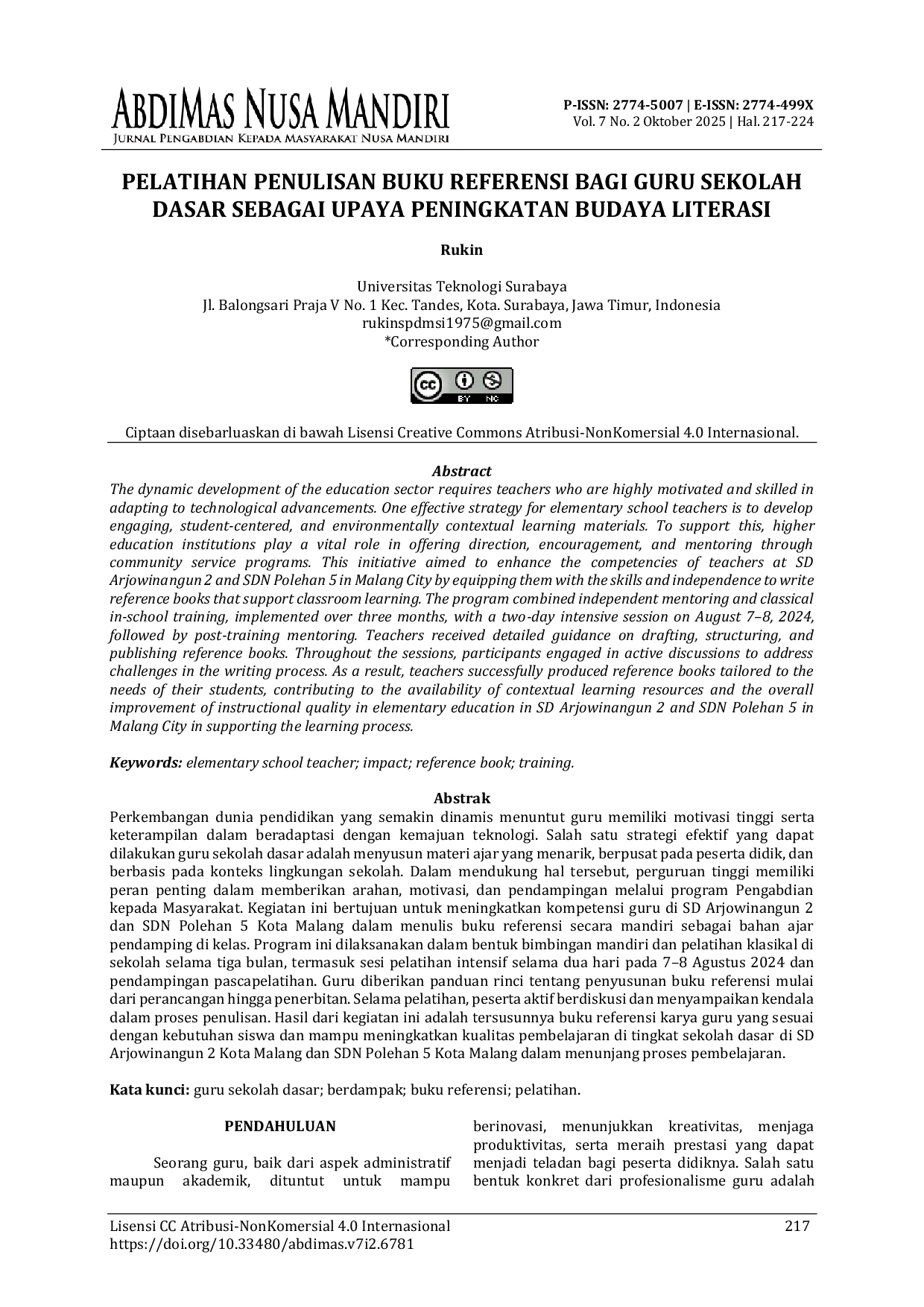 - PELATIHAN PENULISAN BUKU REFERENSI BAGI GURU SEKOLAH DASAR SEBAGAI UPAYA PENINGKATAN BUDAYA LITERASI... doi.org/10.33480/abdimas.v7i2.6781PELATIHAN PENULISAN BUKU REFERENSI BAGI GURU SEKOLAH DASAR SEBAGAI UPAYA PENINGKATAN BUDAYA LITERASI doi 10 33480 abdimas v7i2 6781