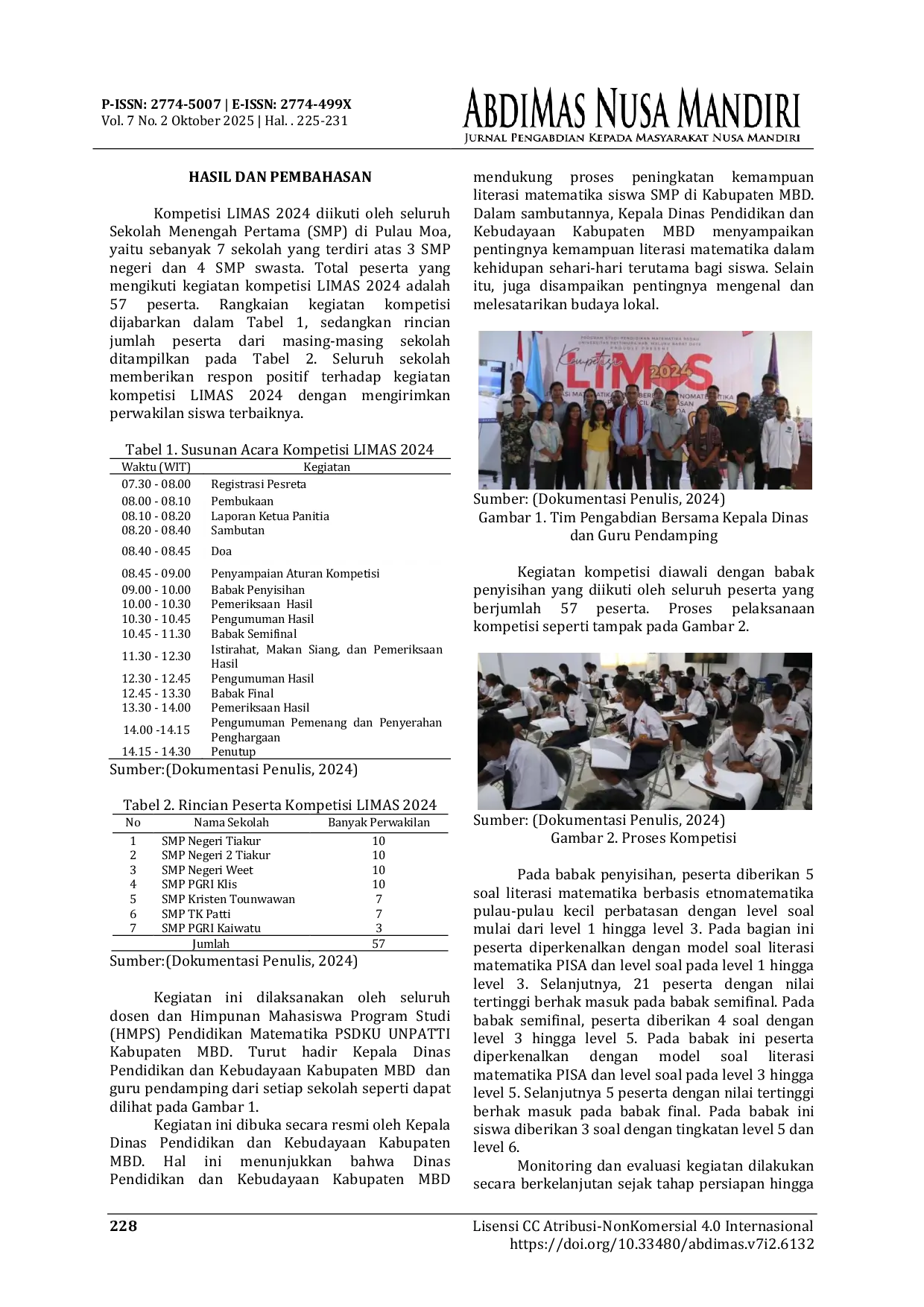 Jurnal AbdiMas Nusa MandiriJurnal AbdiMas Nusa MandiriRendahnya kemampuan literasi matematika siswa SMP di Indonesia, terutama di wilayah Pulau-Pulau Kecil Perbatasan, memerlukan perhatian serius dari berbagai pihak. Peningkatan kemampuan literasi matematika merupakan tanggung jawab bersama yang dapat dimulai dengan pengenalan bentuk soal literasi matematika PISA kepada siswa SMP. Salah satu upaya yang dilakukan adalah melalui kompetisi literasi matematika berbasis etnomatematika. Kompetisi ini bertujuan untuk memberikan pengetahuan dan pemahaman tentang literasi matematika PISA kepada siswa SMP di wilayah Pulau-Pulau Kecil Perbatasan, khususnya di Pulau Moa. Kegiatan ini merupakan bentuk pengabdian kepada masyarakat yang dilaksanakan oleh dosen dan mahasiswa, dengan tahapan pelaksanaan meliputi observasi awal, sosialisasi kegiatan, pelaksanaan kompetisi, dan evaluasi. Peserta dalam kompetisi ini berasal dari tujuh SMP di Pulau Moa dengan jumlah total 57 peserta. Peningkatan pengetahuan peserta mengenai bentuk soal literasi matematika PISA diukur menggunakan kuesioner. Hasil menunjukkan adanya peningkatan pemahaman peserta sebelum dan sesudah mengikuti kompetisi. Namun demikian, data tes juga menunjukkan bahwa kemampuan literasi matematika siswa di Pulau Moa masih tergolong rendah. Oleh karena itu, diperlukan program berkelanjutan untuk meningkatkan kemampuan literasi matematika siswa di wilayah Pulau-Pulau Kecil Perbatasan, termasuk di Pulau Moa.
