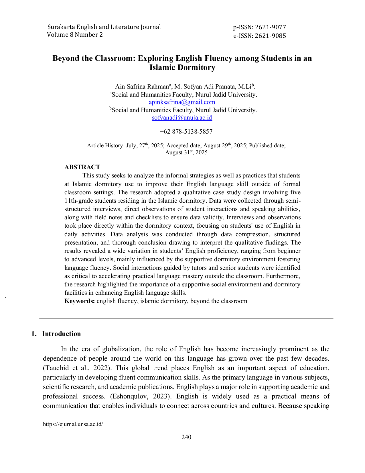 Surakarta English and Literature JournalSurakarta English and Literature JournalThis study seeks to analyze the informal strategies as well as practices that students at Islamic dormitory use to improve their English language skill outside of formal classroom settings. The research adopted a qualitative case study design involving five 11th-grade students residing in the Islamic dormitory. Data were collected through semi-structured interviews, direct observations of student interactions and speaking abilities, along with field notes and checklists to ensure data validity. Interviews and observations took place directly within the dormitory context, focusing on students use of English in daily activities. Data analysis was conducted through data compression, structured presentation, and thorough conclusion drawing to interpret the qualitative findings. The results revealed a wide variation in students English proficiency, ranging from beginner to advanced levels, mainly influenced by the supportive dormitory environment fostering language fluency. Social interactions guided by tutors and senior students were identified as critical to accelerating practical language mastery outside the classroom. Furthermore, the research highlighted the importance of a supportive social environment and dormitory facilities in enhancing English language skills.