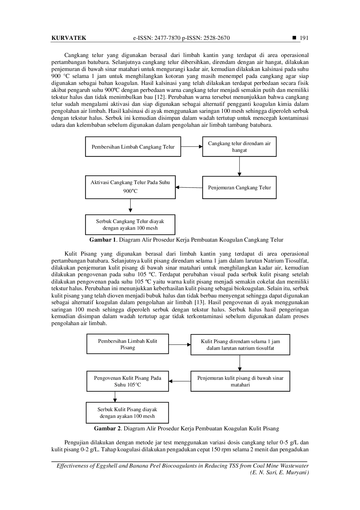 Cangkang telur dan kulit pisang dapat dimanfaatkan sebagai biokoagulan alami untuk menurunkan TSS pada air limbah tambang batubara.Dosis optimum cangkang telur 2 g/L dengan waktu sedimentasi 30 menit dapat menurunkan TSS dari 489 mg/L menjadi 138 mg/L, sementara dosis optimum kulit pisang 1 g/L dengan waktu sedimentasi 30 menit dapat menurunkan TSS menjadi 181 mg/L.Kedua bahan ini terbukti lebih ramah lingkungan dan mendukung prinsip pembangunan berkelanjutan dibandingkan penggunaan koagulan kimia.