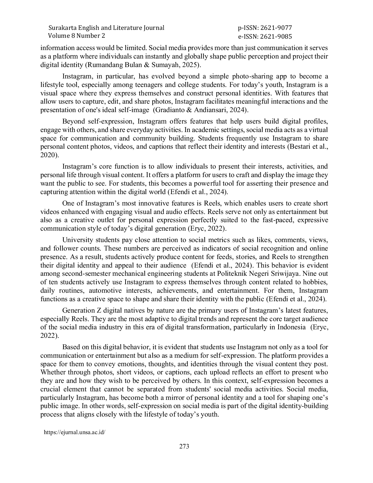 Surakarta English and Literature JournalSurakarta English and Literature JournalPenelitian ini menyelidiki praktik self-disclosure mahasiswa Teknik Mesin di Politeknik Negeri Sriwijaya melalui penggunaan bahasa Inggris di Instagram Reels. Sebagai generasi digital, mahasiswa ini menavigasi konstruksi identitas di ruang online, menggunakan bahasa Inggris sebagai alat komunikasi dan bentuk jarak emosional. Penelitian ini bertujuan untuk memahami bagaimana dan mengapa mahasiswa mengungkapkan konten pribadi dalam bahasa Inggris dan bagaimana hal ini mempengaruhi perkembangan bahasa, ekspresi emosional, dan identitas digital mereka. Dengan menggunakan metode studi kasus kualitatif, data dikumpulkan melalui pengamatan konten Instagram Reels dan wawancara mendalam dengan peserta terpilih. Temuan mengungkapkan bahwa mahasiswa menganggap bahasa Inggris lebih netral dan lebih aman secara emosional, memungkinkan ekspresi yang lebih terbuka tentang pikiran, perjuangan, dan prestasi. Instagram Reels juga berfungsi sebagai platform untuk terapi diri, membangun komunitas, dan pertumbuhan linguistik. Penelitian ini berkontribusi pada pemahaman tentang kinerja diri digital di antara mahasiswa vokasi di jurusan non-Inggris dan menawarkan wawasan tentang persimpangan penggunaan bahasa, self-expression, dan literasi media dalam konteks pendidikan kontemporer.