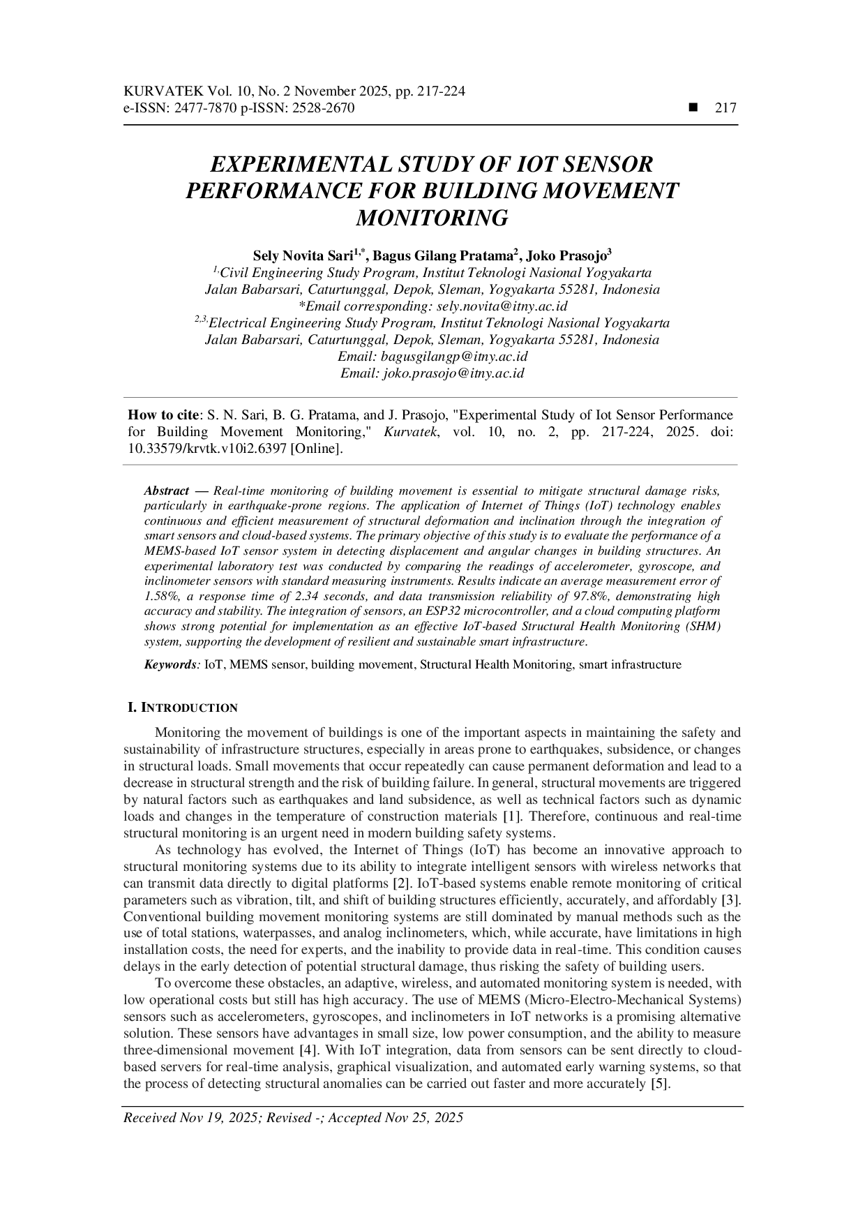 KURVATEKKURVATEKPemantauan real‑time pergerakan bangunan sangat penting untuk mengurangi risiko kerusakan struktural, khususnya di wilayah rawan gempa. Penerapan teknologi Internet of Things (IoT) memungkinkan pengukuran kontinu dan efisien terhadap deformasi serta kemiringan struktural melalui integrasi sensor pintar dan sistem berbasis awan. Tujuan utama penelitian ini adalah mengevaluasi kinerja sistem sensor IoT berbasis MEMS dalam mendeteksi perpindahan dan perubahan sudut pada struktur bangunan. Pengujian laboratorium eksperimental dilakukan dengan membandingkan pembacaan sensor akselerometer, giroskop, dan inclinometer dengan instrumen pengukuran standar. Hasil menunjukkan rata‑rata kesalahan pengukuran sebesar 1,58 %, waktu respons 2,34 detik, dan keandalan transmisi data 97,8 %, yang menandakan akurasi dan stabilitas tinggi. Integrasi sensor, mikrokontroler ESP32, dan platform komputasi awan menunjukkan potensi kuat untuk diimplementasikan sebagai sistem Structural Health Monitoring (SHM) berbasis IoT yang efektif, mendukung pengembangan infrastruktur pintar yang tangguh dan berkelanjutan.