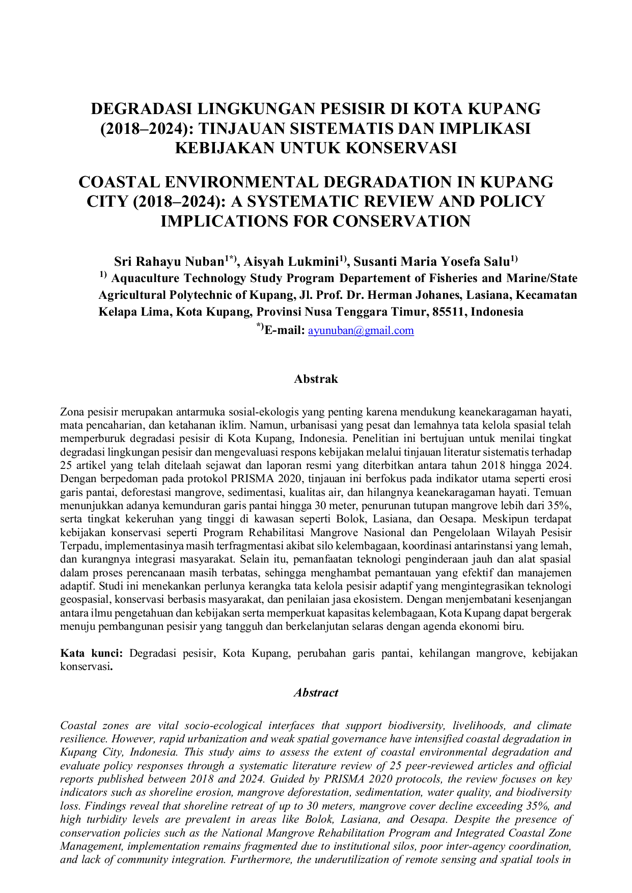 Penelitian ini menyimpulkan bahwa zona pesisir Kota Kupang mengalami degradasi lingkungan yang signifikan, ditandai dengan erosi pantai, deforestasi mangrove, sedimentasi, dan penurunan keanekaragaman hayati.Degradasi ini diperparah oleh lemahnya koordinasi antar lembaga, kurangnya integrasi masyarakat dalam kebijakan konservasi, dan pemanfaatan teknologi spasial yang terbatas.Untuk mengatasi masalah ini, diperlukan kerangka tata kelola pesisir adaptif yang mengintegrasikan teknologi geospasial, konservasi berbasis masyarakat, dan penilaian jasa ekosistem guna mencapai pembangunan pesisir yang berkelanjutan.
