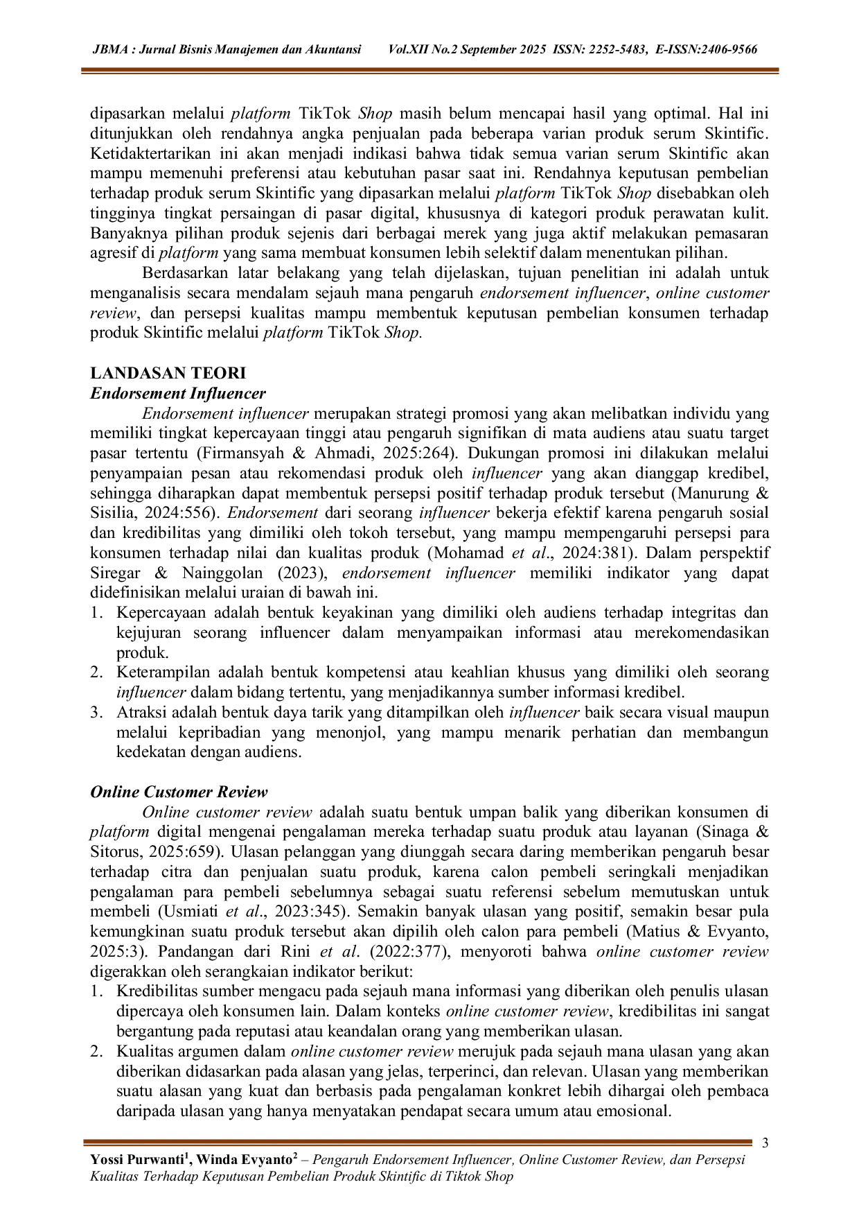 Berdasarkan hasil penelitian, saran penelitian lanjutan yang dapat diusulkan adalah: (1) Menganalisis faktor-faktor lain yang dapat mempengaruhi keputusan pembelian, seperti harga, promosi, dan faktor-faktor psikologis konsumen. (2) Meneliti pengaruh endorsement influencer pada platform media sosial yang berbeda, seperti Instagram atau YouTube, untuk melihat apakah ada perbedaan pengaruh. (3) Mengkaji strategi pemasaran yang efektif untuk meningkatkan kualitas produk dan persepsi konsumen terhadap produk Skintific.