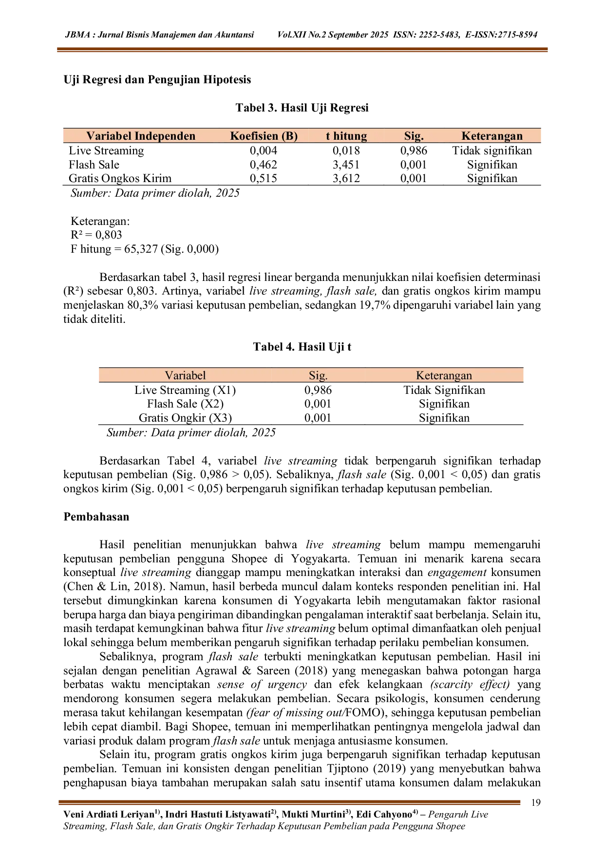 Kesimpulan penelitian ini menunjukkan bahwa flash sale dan gratis ongkos kirim berpengaruh signifikan terhadap keputusan pembelian pengguna Shopee di Yogyakarta, sementara live streaming tidak.Ini menegaskan bahwa strategi promosi berbasis harga dan biaya pengiriman lebih dominan, mendorong Shopee untuk memprioritaskan insentif ini dan meningkatkan live streaming dengan konten yang lebih interaktif.Untuk riset mendatang, disarankan mengeksplorasi kualitas layanan digital, kepercayaan, dan pengalaman pengguna demi pemahaman komprehensif.