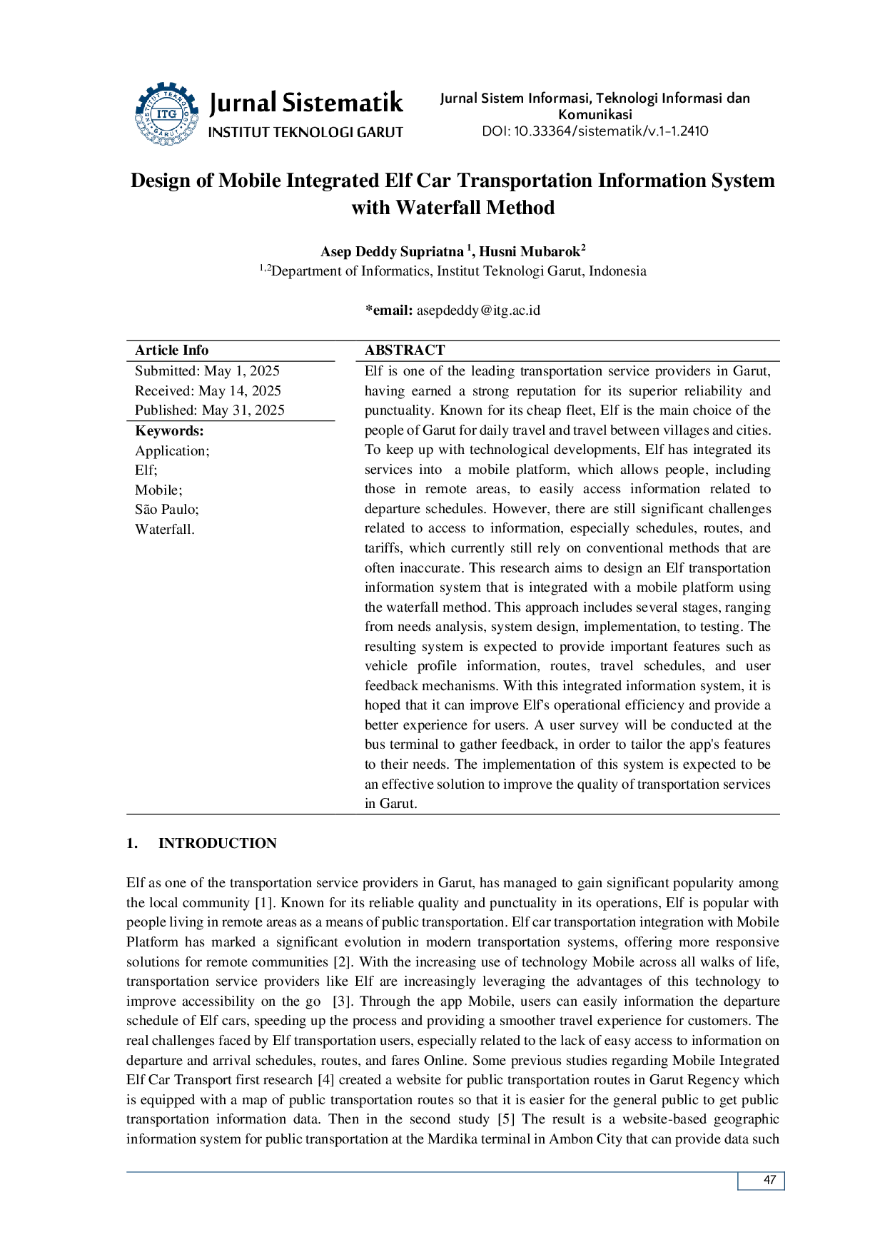 Jurnal SistematikJurnal SistematikElf merupakan salah satu penyedia layanan transportasi terkemuka di Garut, yang telah memperoleh reputasi kuat atas keandalan dan ketepatan waktunya. Dikenal dengan armada yang terjangkau, Elf menjadi pilihan utama masyarakat Garut untuk perjalanan harian serta antar desa dan kota. Untuk mengikuti perkembangan teknologi, Elf mengintegrasikan layanannya ke dalam platform mobile, yang memungkinkan masyarakat, termasuk yang berada di daerah terpencil, mengakses informasi jadwal keberangkatan secara mudah. Namun, masih terdapat tantangan signifikan terkait akses informasi, khususnya jadwal, rute, dan tarif, yang saat ini masih mengandalkan metode konvensional yang sering tidak akurat. Penelitian ini bertujuan merancang sistem informasi transportasi Elf yang terintegrasi dengan platform mobile menggunakan metode waterfall. Pendekatan ini meliputi beberapa tahap, mulai dari analisis kebutuhan, perancangan sistem, implementasi, hingga pengujian. Sistem yang dihasilkan diharapkan menyediakan fitur penting seperti informasi profil kendaraan, rute, jadwal perjalanan, dan mekanisme umpan balik pengguna. Dengan sistem informasi terintegrasi ini, diharapkan dapat meningkatkan efisiensi operasional Elf dan memberikan pengalaman yang lebih baik bagi pengguna. Survei pengguna akan dilakukan di terminal bus untuk mengumpulkan masukan, guna menyesuaikan fitur aplikasi dengan kebutuhan mereka. Implementasi sistem ini diharapkan menjadi solusi efektif untuk meningkatkan kualitas layanan transportasi di Garut.
