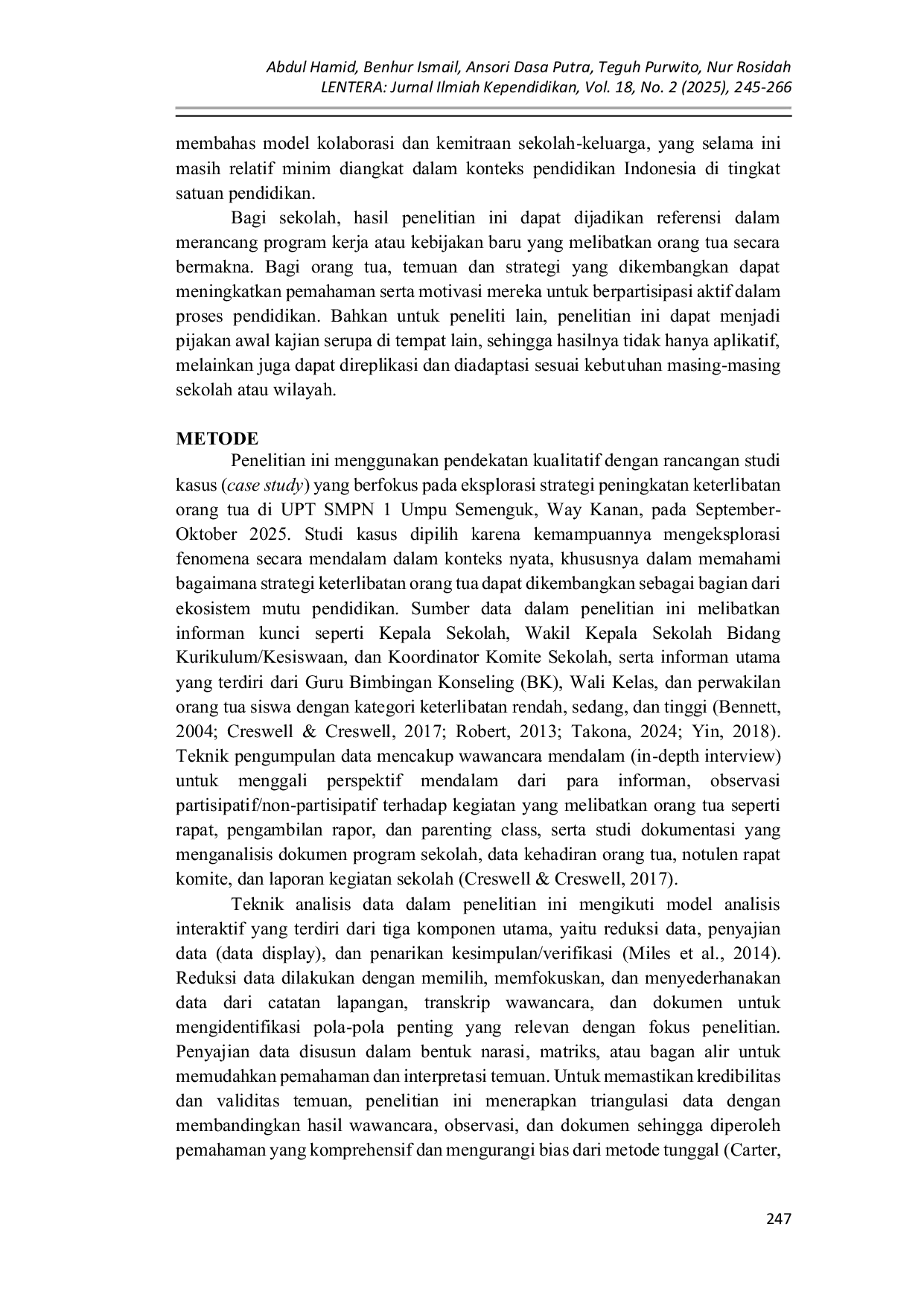 Lentera: Jurnal Ilmiah KependidikanLentera: Jurnal Ilmiah KependidikanKeterlibatan orang tua sebagai mitra aktif dalam ekosistem pendidikan merupakan faktor penting dalam mempengaruhi kualitas pendidikan. Penelitian ini bertujuan untuk menganalisis kondisi keterlibatan orang tua saat ini, mengidentifikasi hambatan dan pendorong, serta merumuskan strategi untuk meningkatkan keterlibatan orang tua di UPT SMPN 1 Umpu Semenguk, Way Kanan. Penelitian menggunakan pendekatan kualitatif dengan desain studi kasus pada September-Oktober 2025. Data dikumpulkan melalui wawancara mendalam dengan kepala sekolah, wakil kepala sekolah, guru, dan orang tua, serta observasi dan studi dokumentasi. Hasil menunjukkan bahwa keterlibatan orang tua masih pada tahap partisipasi pasif, didominasi oleh sumbangan dana dan kehadiran dalam acara formal, sementara kontribusi waktu dan partisipasi dalam pengambilan keputusan sangat rendah. Hambatan utama meliputi kesibukan kerja, kurangnya pemahaman kurikulum, dan komunikasi satu arah, sedangkan pendorong meliputi kepemimpinan kepala sekolah dan trigger masalah atau prestasi anak. Strategi yang direkomendasikan mencakup peningkatan komunikasi dua arah, pemberdayaan orang tua sebagai mentor dan sumber daya, pelatihan parenting yang relevan, dan pengakuan formal. Model ekosistem kemitraan yang diusulkan mengadopsi Epsteins Framework of Six Types of Involvement dengan kontekstualisasi lokal untuk meningkatkan kualitas pendidikan secara berkelanjutan.
