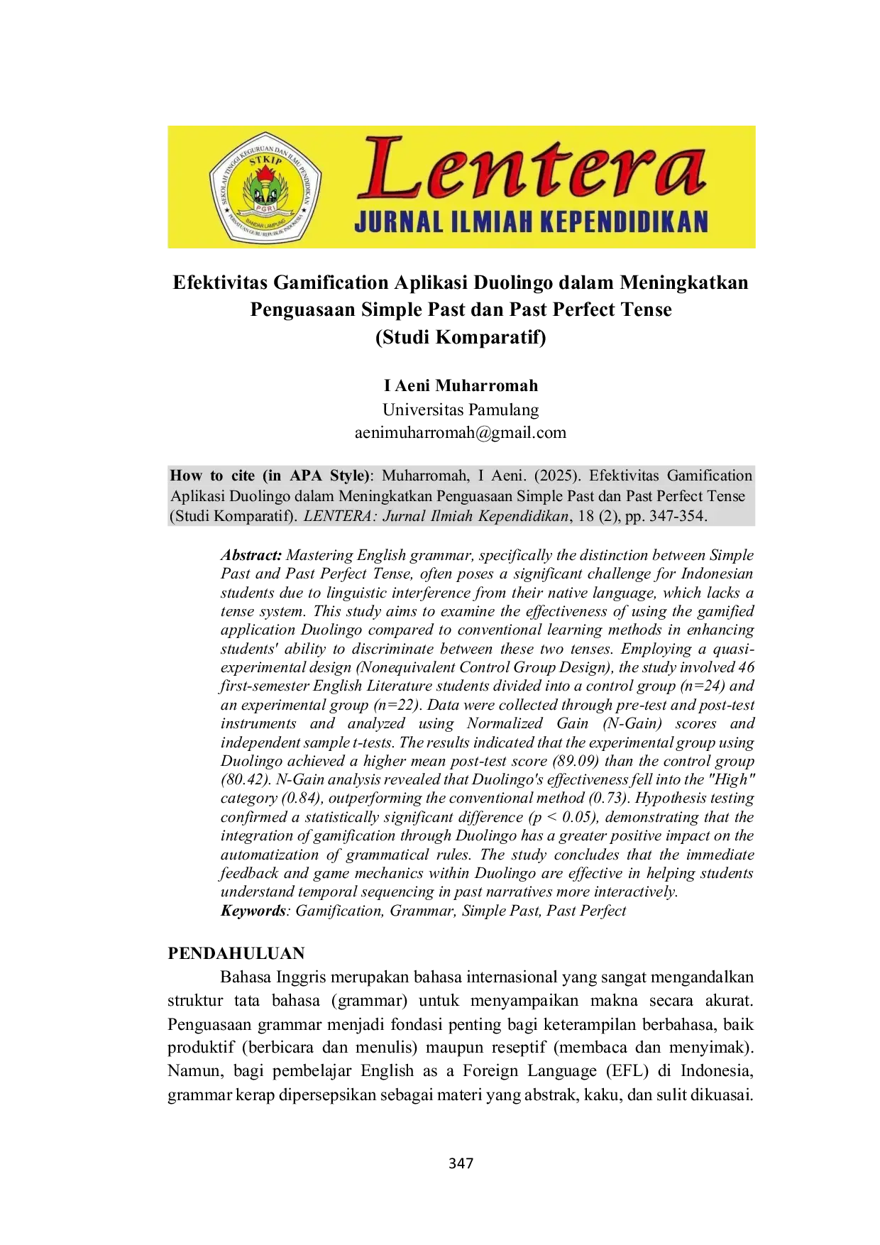 Lentera: Jurnal Ilmiah KependidikanLentera: Jurnal Ilmiah KependidikanPenguasaan tata bahasa, khususnya pembedaan Simple Past dan Past Perfect Tense, sering menjadi tantangan bagi pembelajar Bahasa Inggris di Indonesia karena interferensi bahasa asli yang tidak memiliki sistem tenses. Penelitian ini bertujuan menguji efektivitas penggunaan aplikasi Duolingo (berbasis gamifikasi) dibandingkan metode konvensional dalam meningkatkan kemampuan siswa membedakan dua tense tersebut. Metode penelitian berupa eksperimen semu (Nonequivalent Control Group Design) dengan 46 subjek mahasiswa semester I Sastra Inggris, dibagi menjadi kelompok eksperimen (n=22) dan kontrol (n=24). Data dianalisis melalui N-Gain dan independent sample t-test. Hasil menunjukkan kelompok eksperimen mencapai skor post-test rata-rata 89,09 (N-Gain 0,84) dibanding kontrol 80,42 (N-Gain 0,73), dengan perbedaan statistik signifikan (p < 0,05). Kesimpulan menekankan efektivitas gamifikasi Duolingo melalui fitur umpan balik instan, latihan berulang, dan visualisasi alur waktu yang mempercepat otomatisasi aturan gramatikal.
