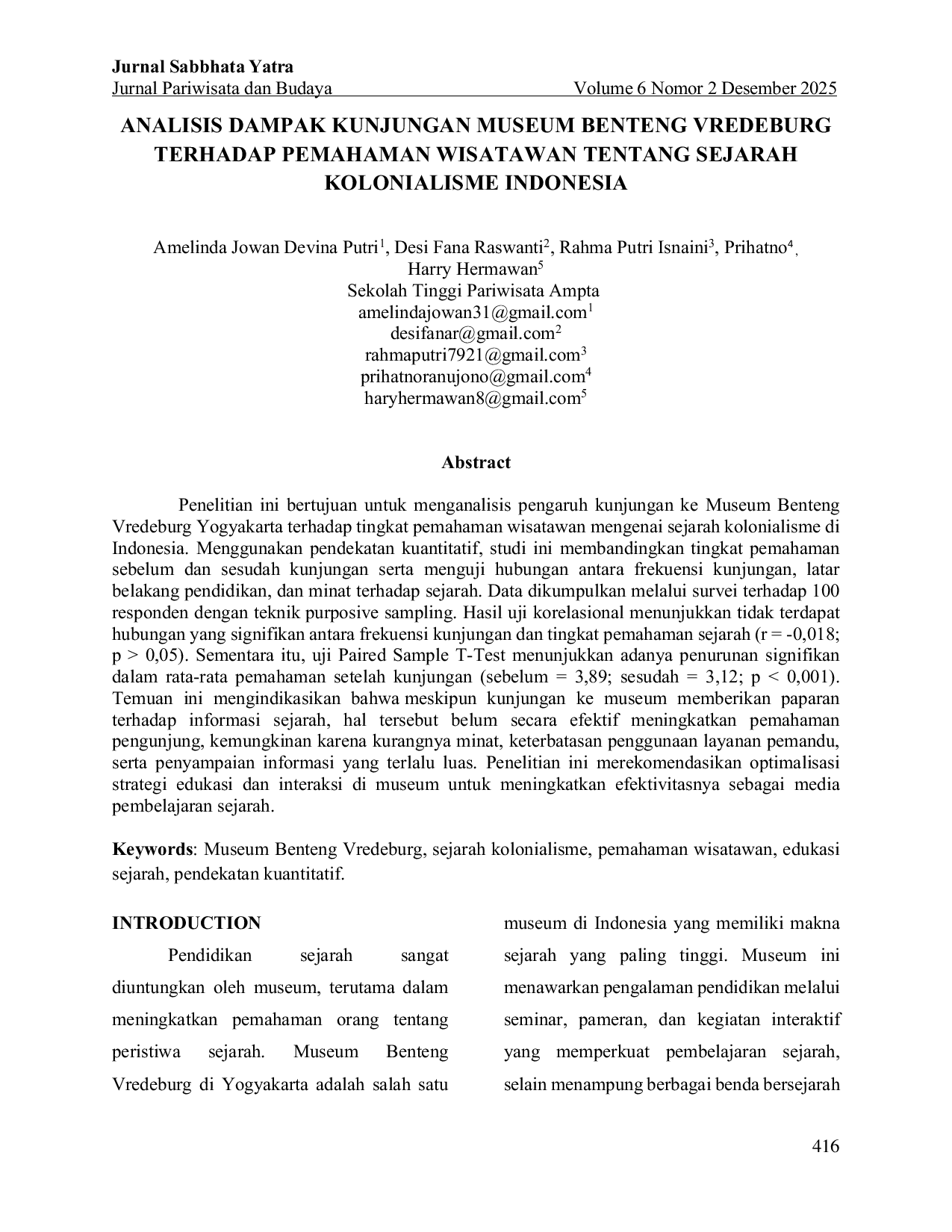 Sabbhata Yatra: Jurnal Pariwisata dan BudayaSabbhata Yatra: Jurnal Pariwisata dan BudayaPenelitian ini bertujuan untuk menganalisis pengaruh kunjungan ke Museum Benteng Vredeburg Yogyakarta terhadap tingkat pemahaman wisatawan mengenai sejarah kolonialisme di Indonesia. Menggunakan pendekatan kuantitatif, studi ini membandingkan tingkat pemahaman sebelum dan sesudah kunjungan serta menguji hubungan antara frekuensi kunjungan, latar belakang pendidikan, dan minat terhadap sejarah. Data dikumpulkan melalui survei terhadap 100 responden dengan teknik purposive sampling. Hasil uji korelasional menunjukkan tidak terdapat hubungan yang signifikan antara frekuensi kunjungan dan tingkat pemahaman sejarah (r = -0,018; p > 0,05). Sementara itu, uji Paired Sample T-Test menunjukkan adanya penurunan signifikan dalam rata-rata pemahaman setelah kunjungan (sebelum = 3,89; sesudah = 3,12; p < 0,001). Temuan ini mengindikasikan bahwa meskipun kunjungan ke museum memberikan paparan terhadap informasi sejarah, hal tersebut belum secara efektif meningkatkan pemahaman pengunjung, kemungkinan karena kurangnya minat, keterbatasan penggunaan layanan pemandu, serta penyampaian informasi yang terlalu luas. Penelitian ini merekomendasikan optimalisasi strategi edukasi dan interaksi di museum untuk meningkatkan efektivitasnya sebagai media pembelajaran sejarah.